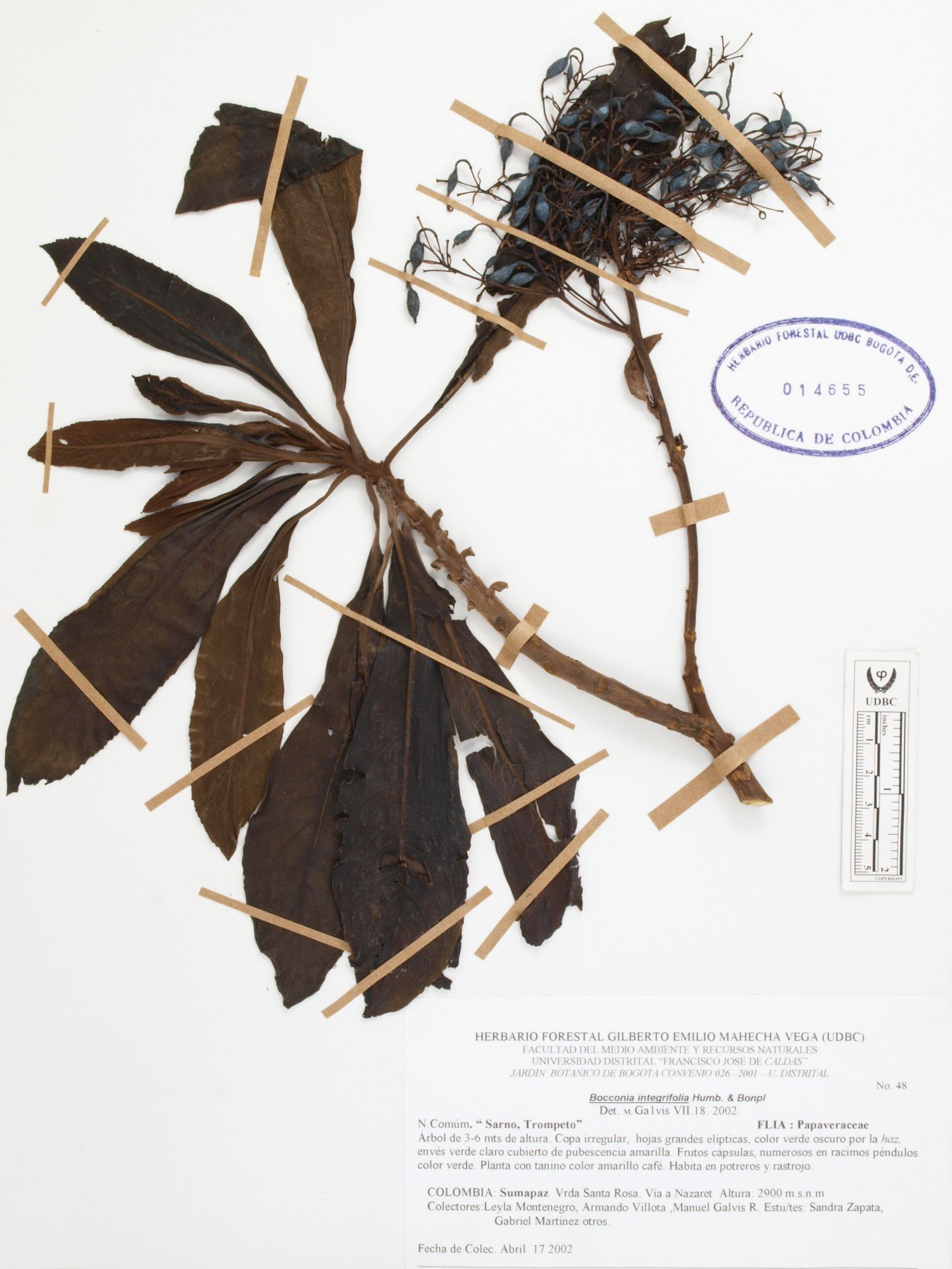 Fotografía del ejemplar Montenegro, L. 48, determinado como Bocconia integrifolia en el año 2002