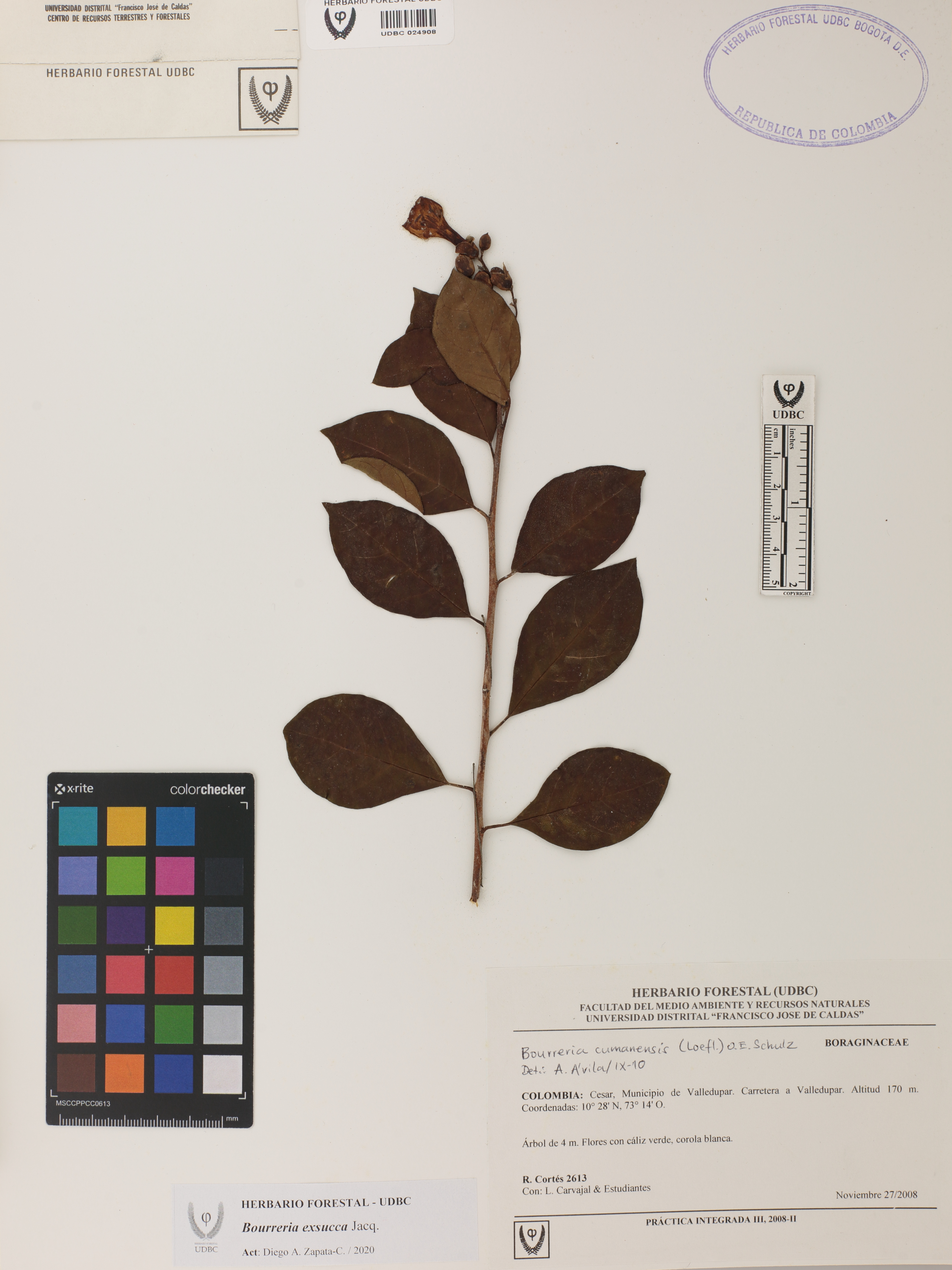 Fotografía del ejemplar Cortés-B., R. 2613, determinado como Bourreria exsucca en el año 2010