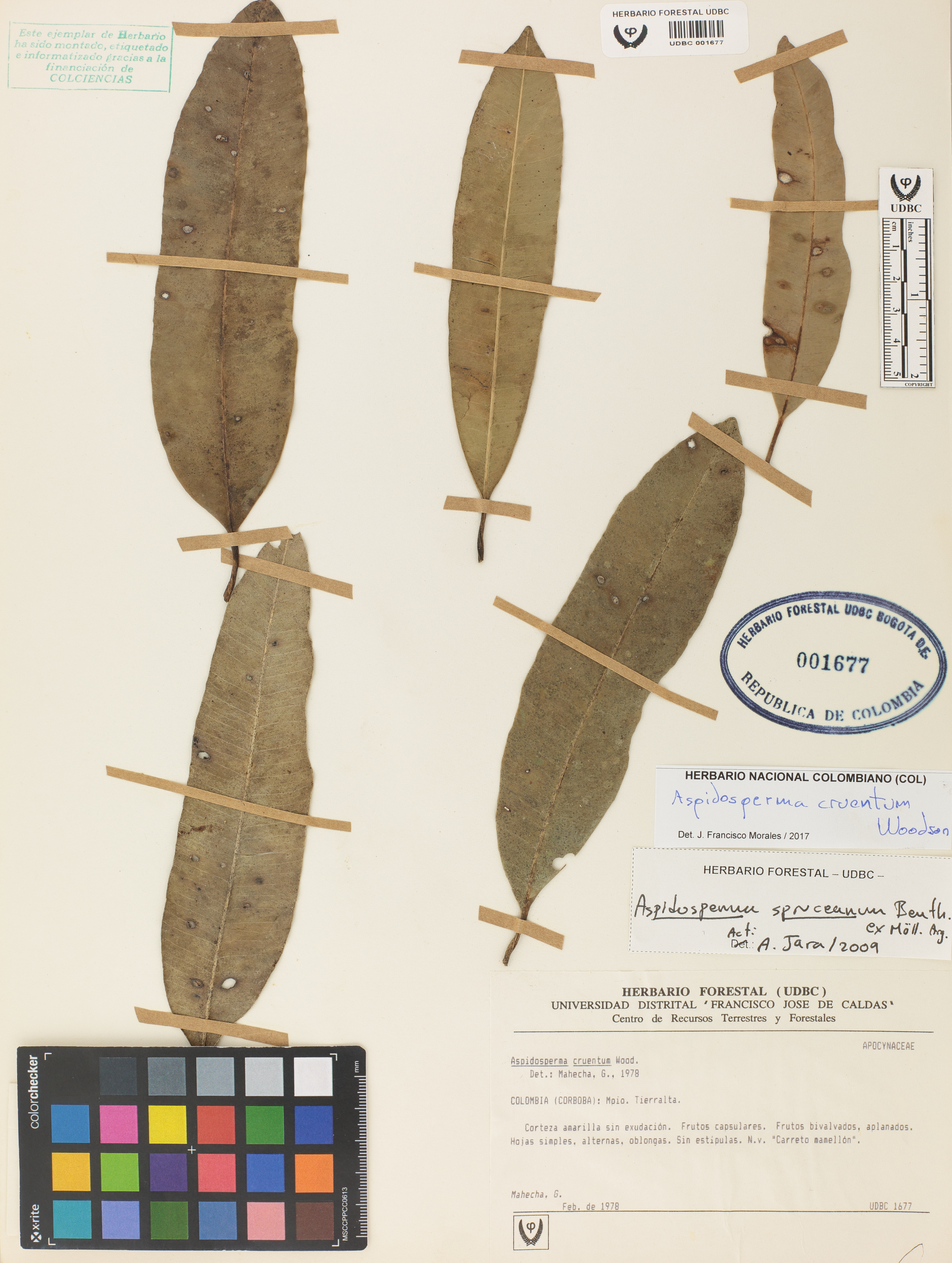 Fotografía del ejemplar Mahecha, G., determinado como Aspidosperma cruentum en el año 2017