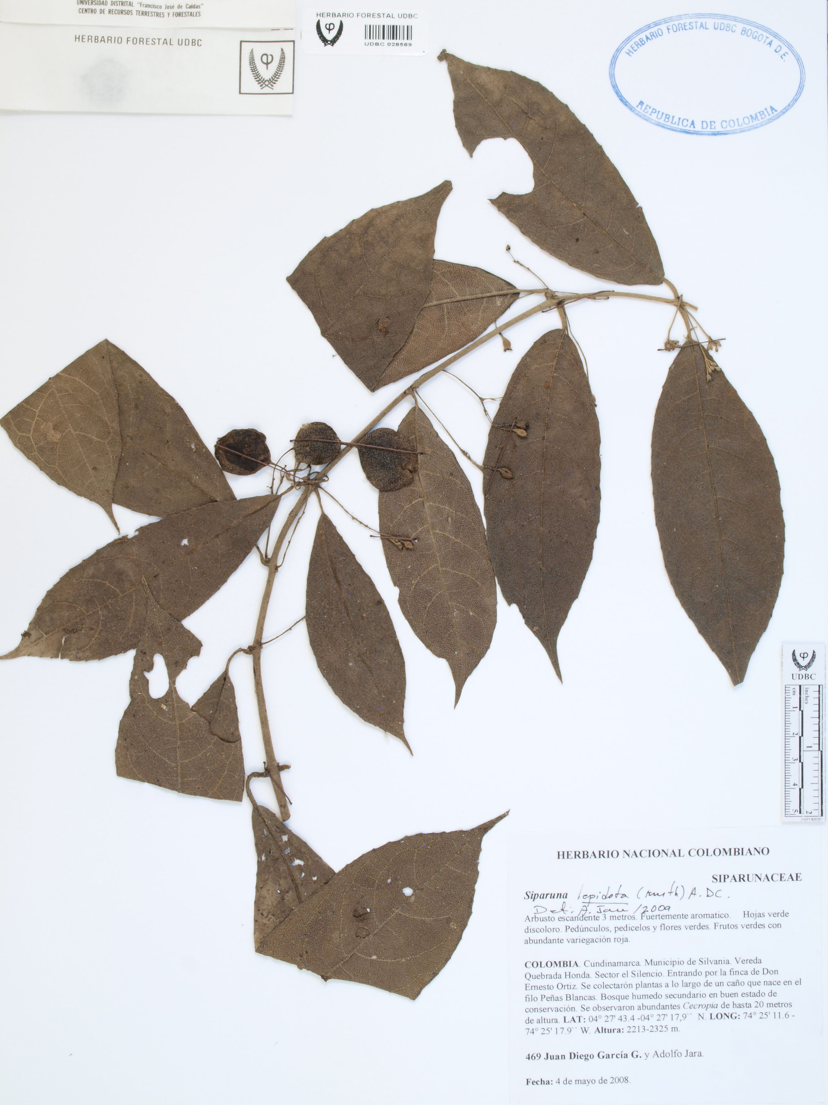 Fotografía del ejemplar García-G., J. 469, determinado como Siparuna lepidota en el año 2009