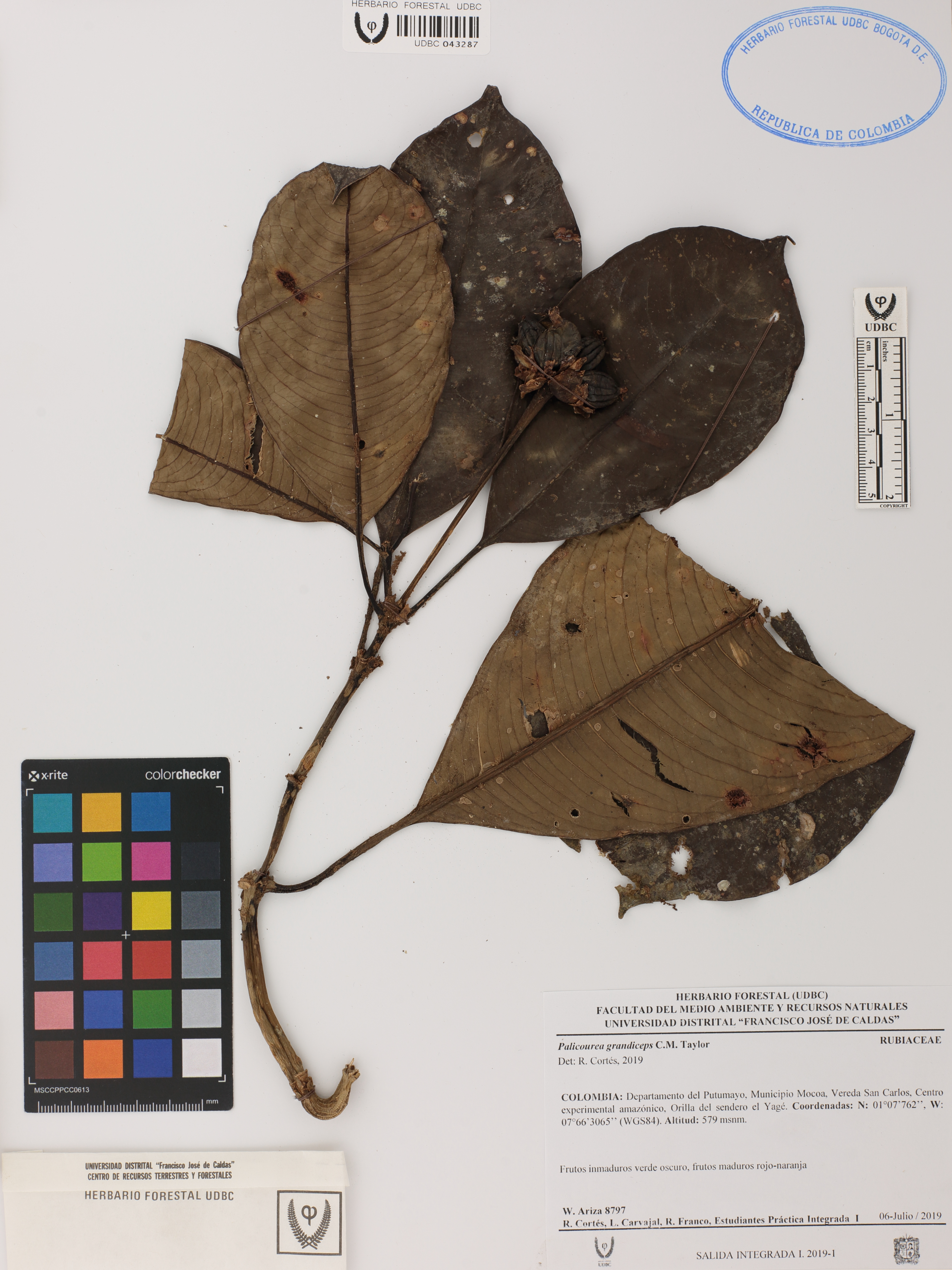 Fotografía del ejemplar Ariza, W. 8797, determinado como Palicourea grandiceps en el año 2019