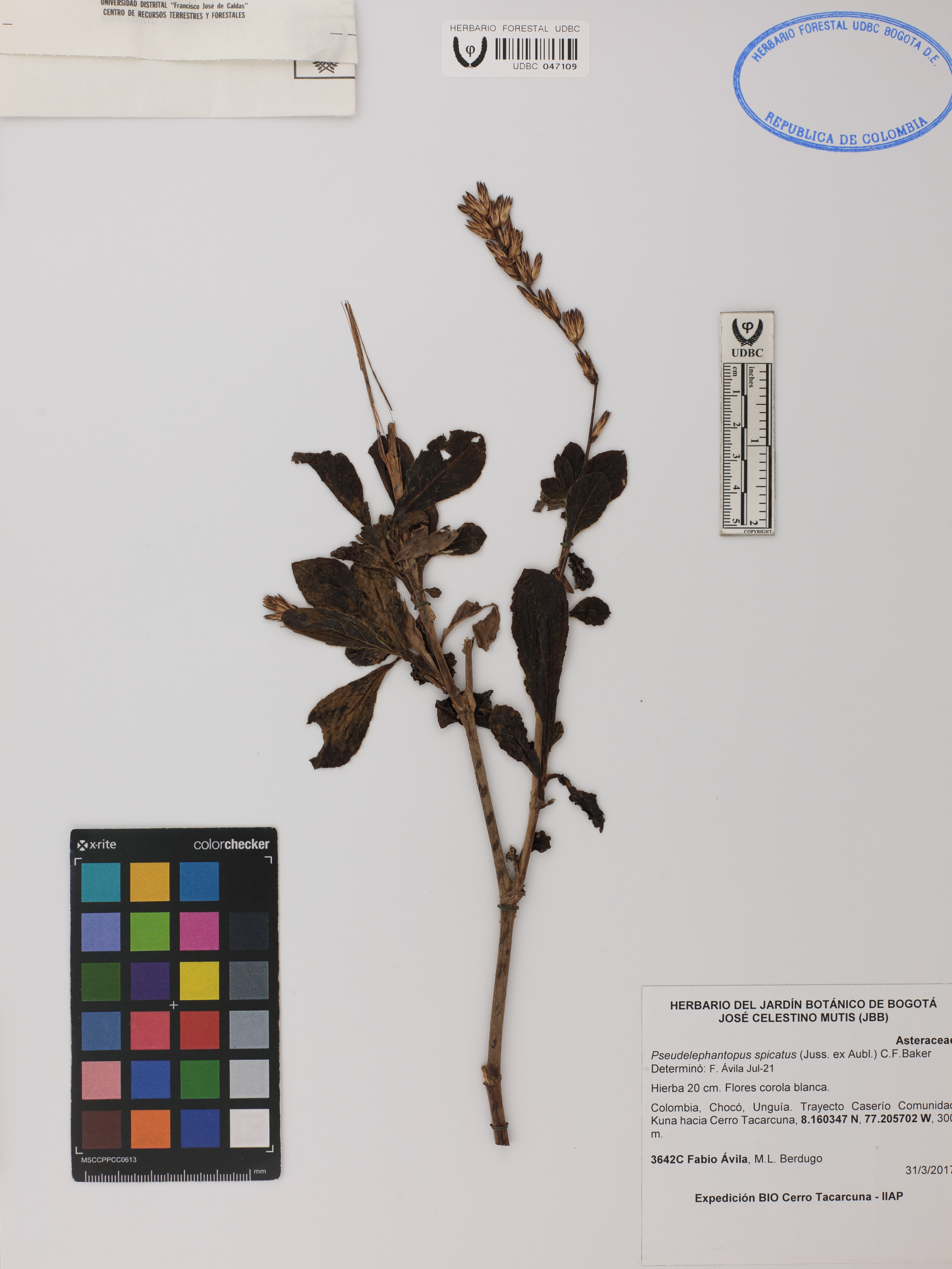 Fotografía del ejemplar Ávila, F. 3642C, determinado como Pseudelephantopus spicatus en el año 2021