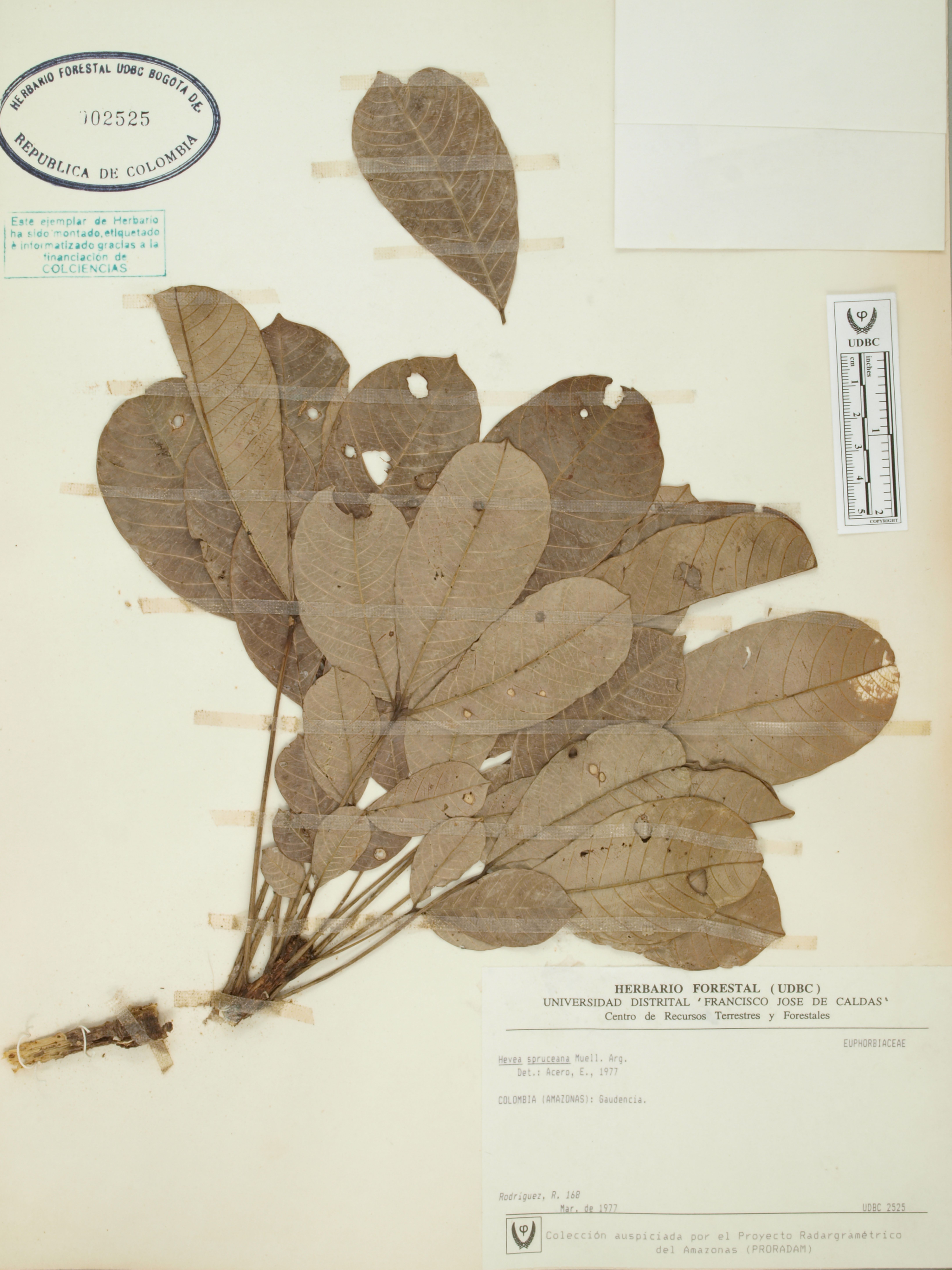 Fotografía del ejemplar Rodríguez, R. 168, determinado como Hevea spruceana en el año 1977