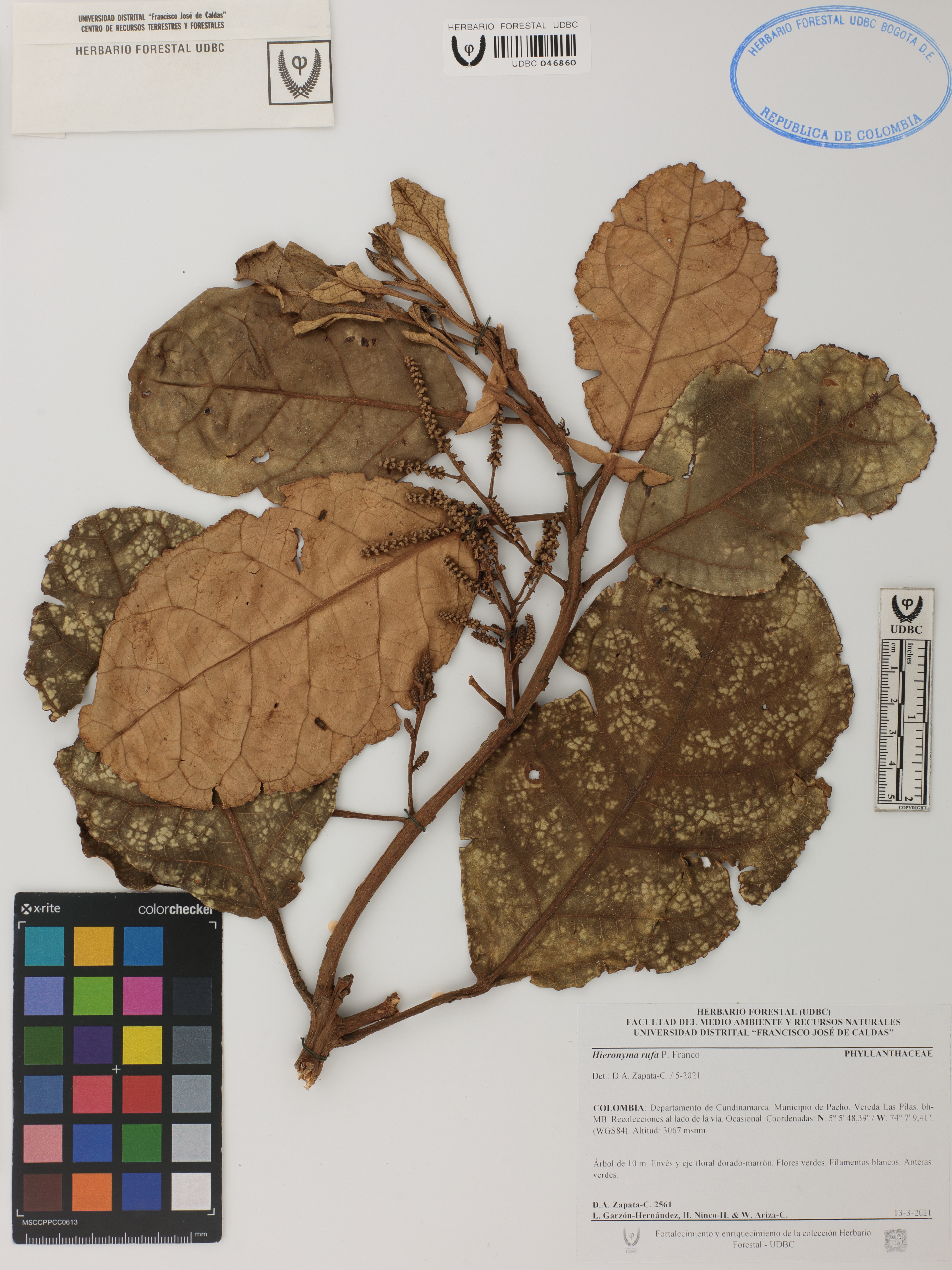Fotografía del ejemplar Zapata-C., D. 2561, determinado como Hieronyma rufa en el año 2021