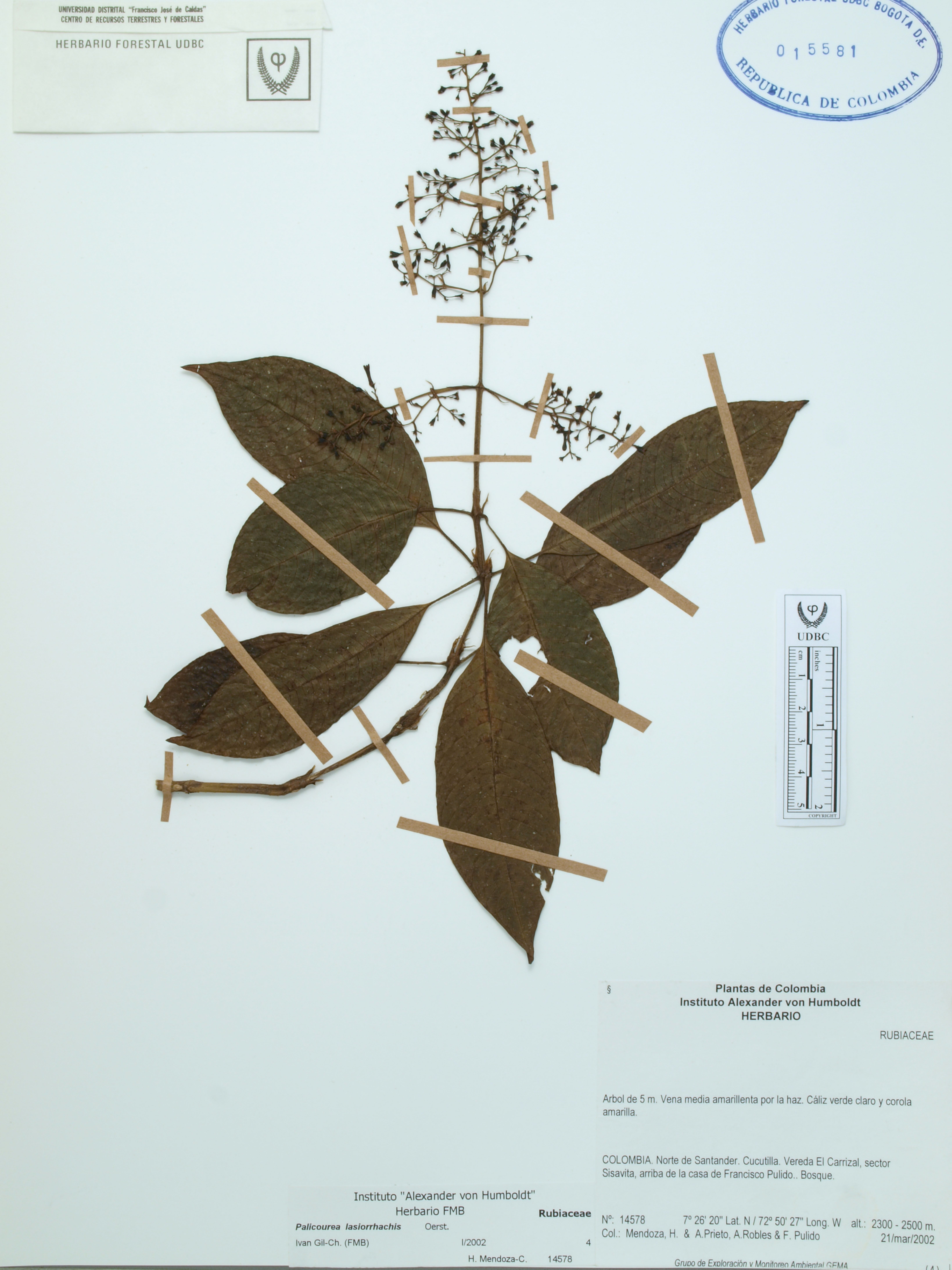 | dc.description | Fotografía del ejemplar Mendoza, H. 14578, determinado como Palicourea lasiorrhachis en el año 2002 | |