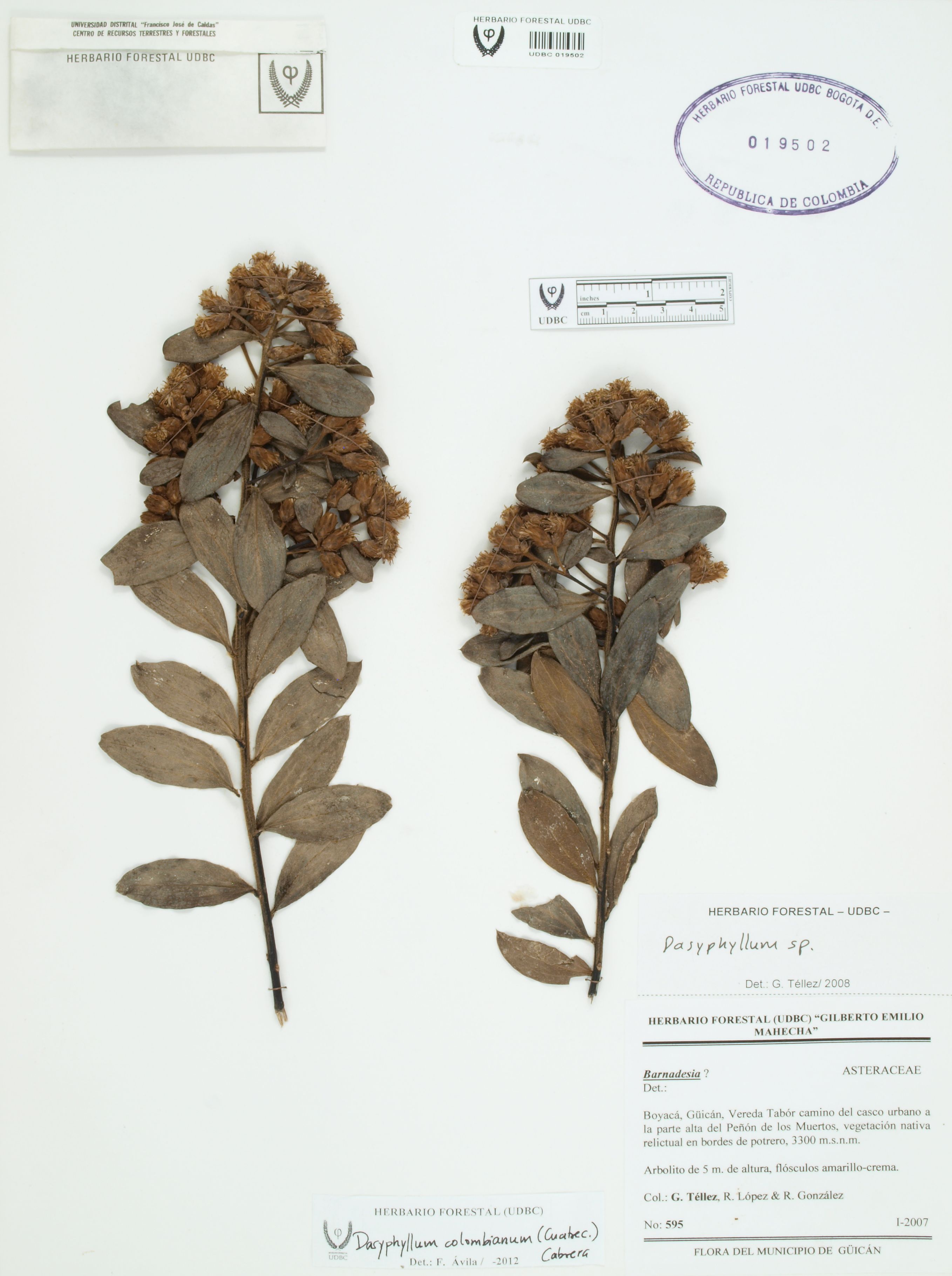 | dc.description | Fotografía del ejemplar Téllez, G. 595, determinado como Dasyphyllum colombianum en el año 2012 | |