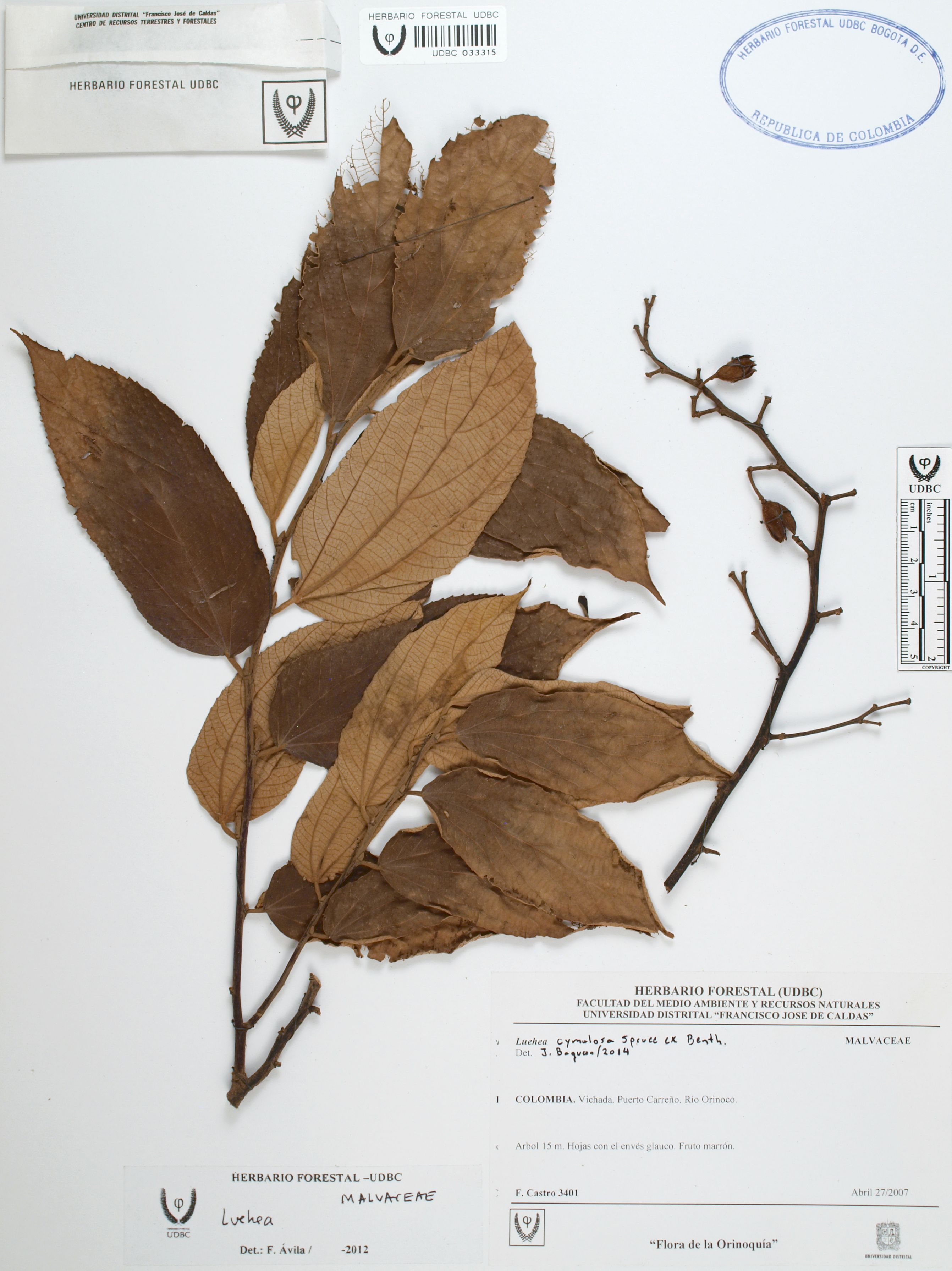 Fotografía del ejemplar Castro, F. 3401, determinado como Luehea cymulosa en el año 2014