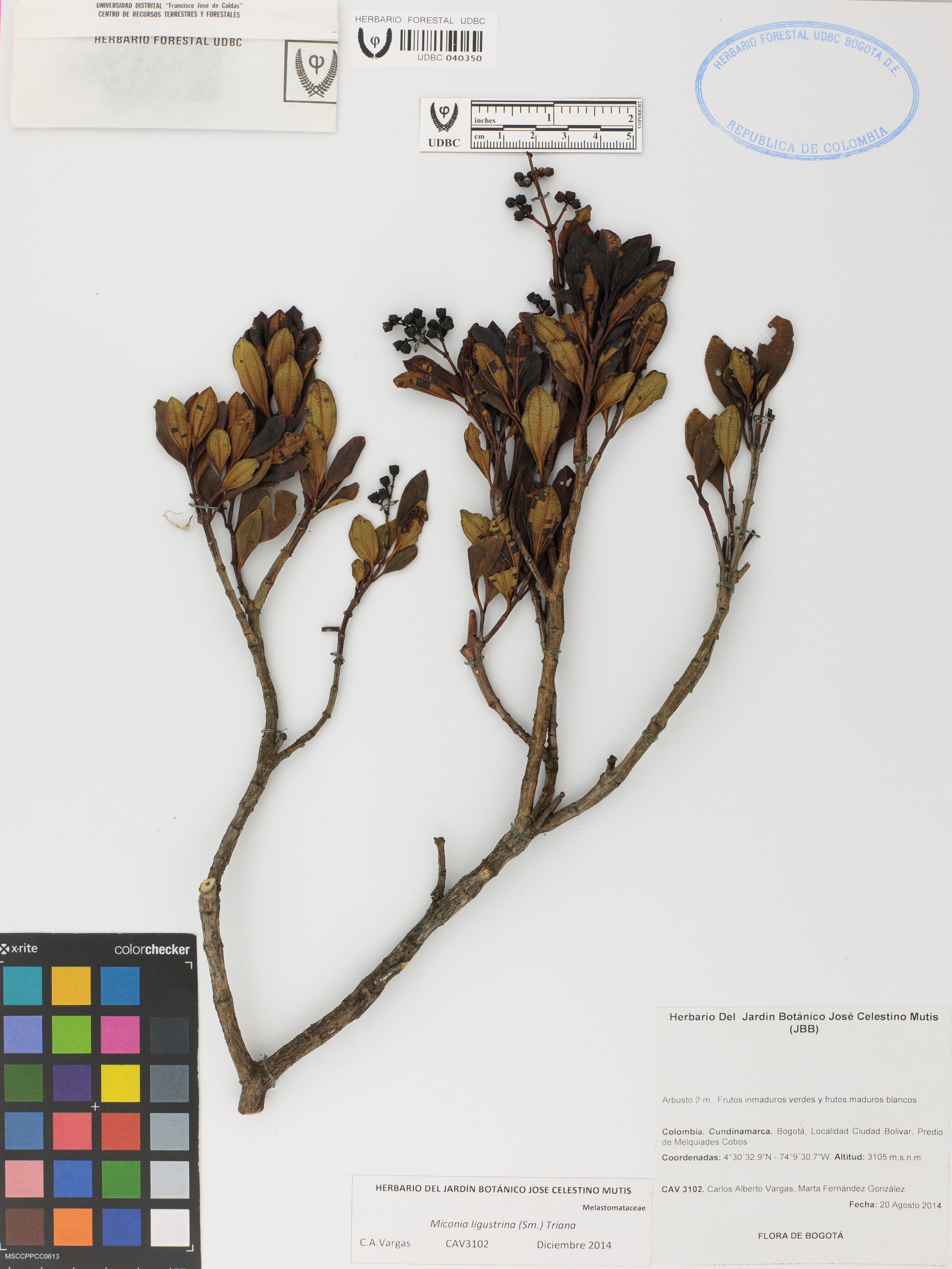 Fotografía del ejemplar Vargas, C. 3102, determinado como Miconia ligustrina en el año 2014