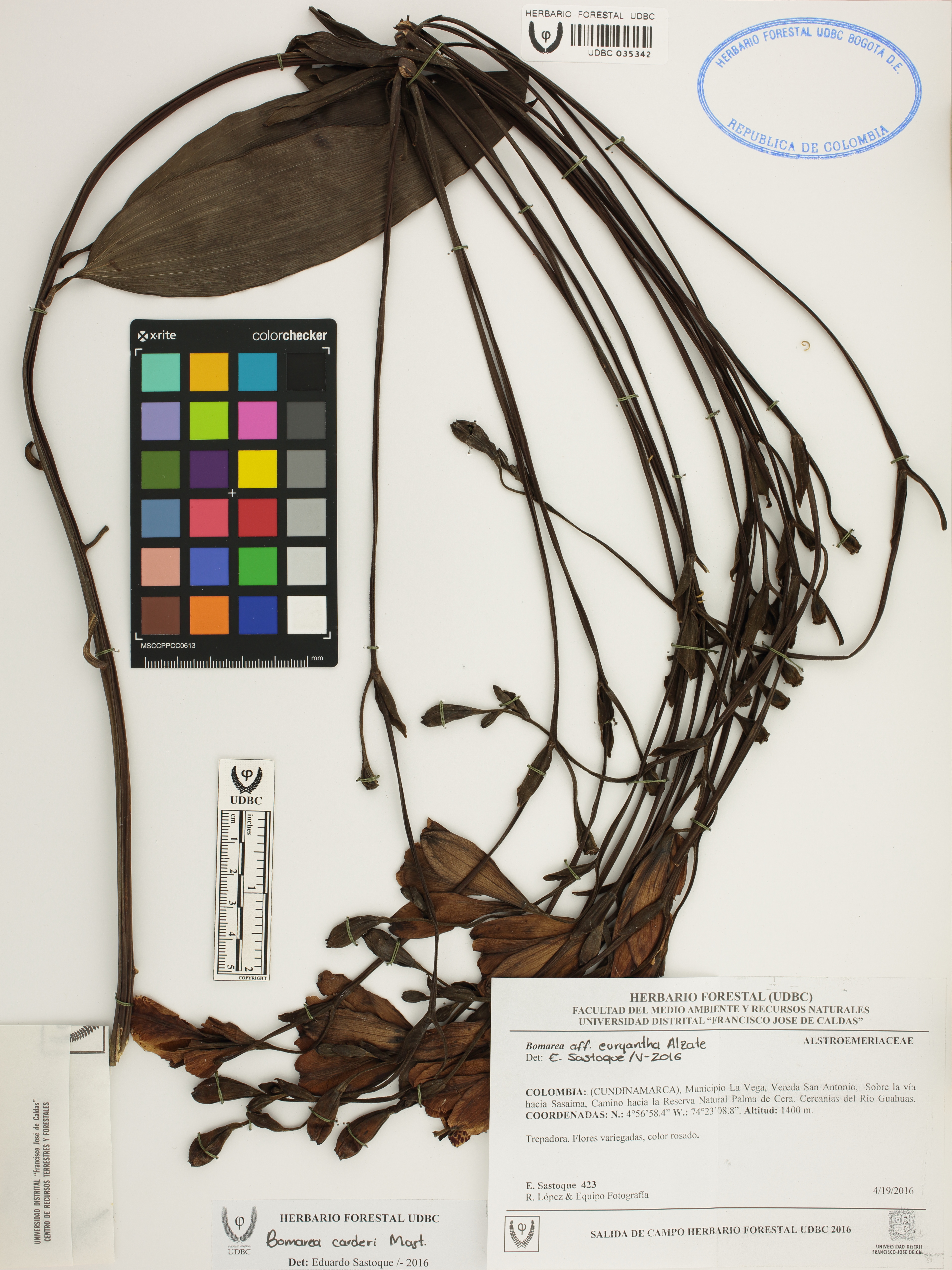Fotografía del ejemplar Sastoque, E. 423, determinado como Bomarea carderi en el año 2016