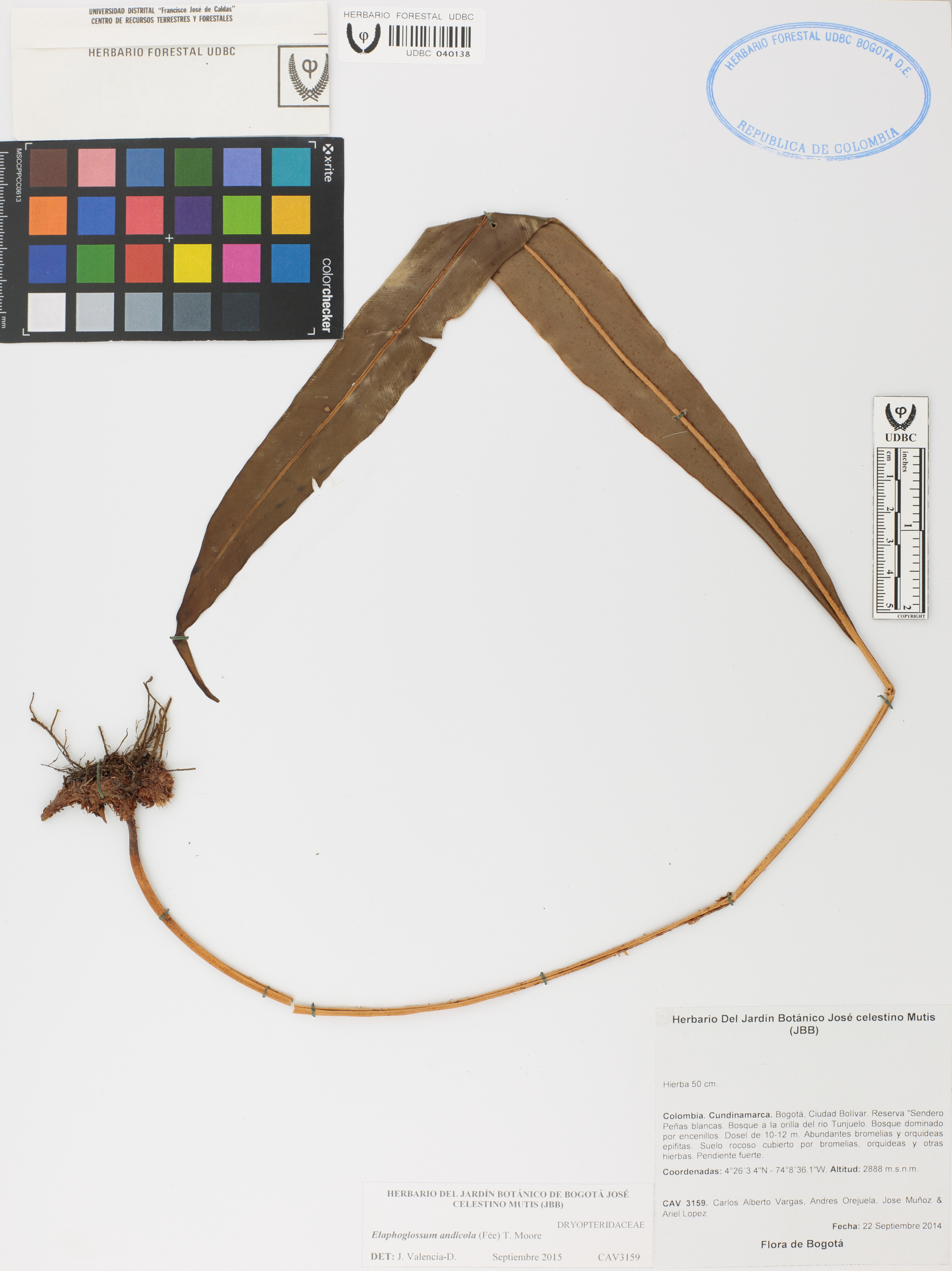 Fotografía del ejemplar Vargas, C. 3159, determinado como Elaphoglossum andicola en el año 2015