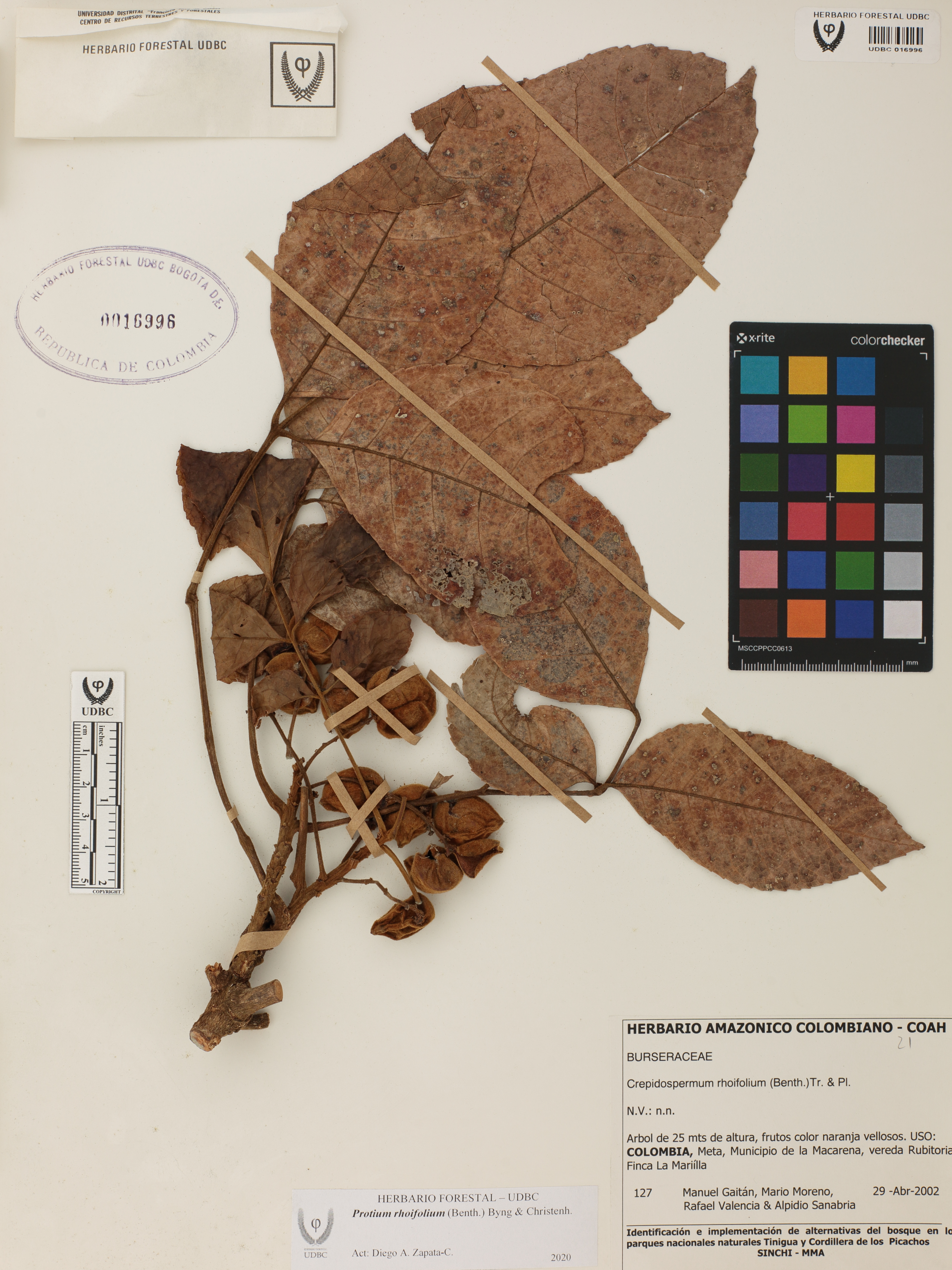 Fotografía del ejemplar Gaitán, M. 127, determinado como Protium rhoifolium en el año 2002