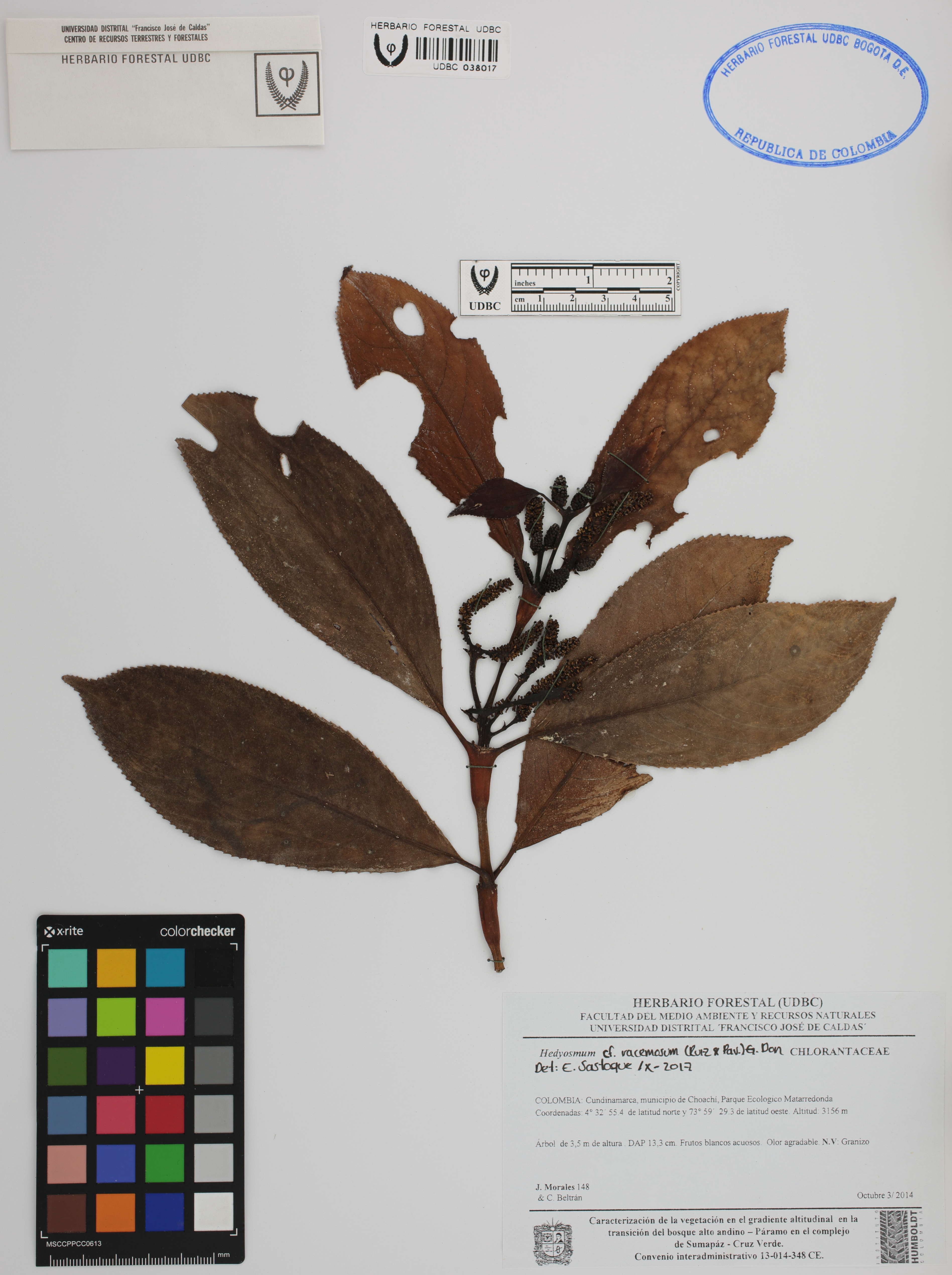 Fotografía del ejemplar Morales, J. 148, determinado como Hedyosmum racemosum en el año 2017