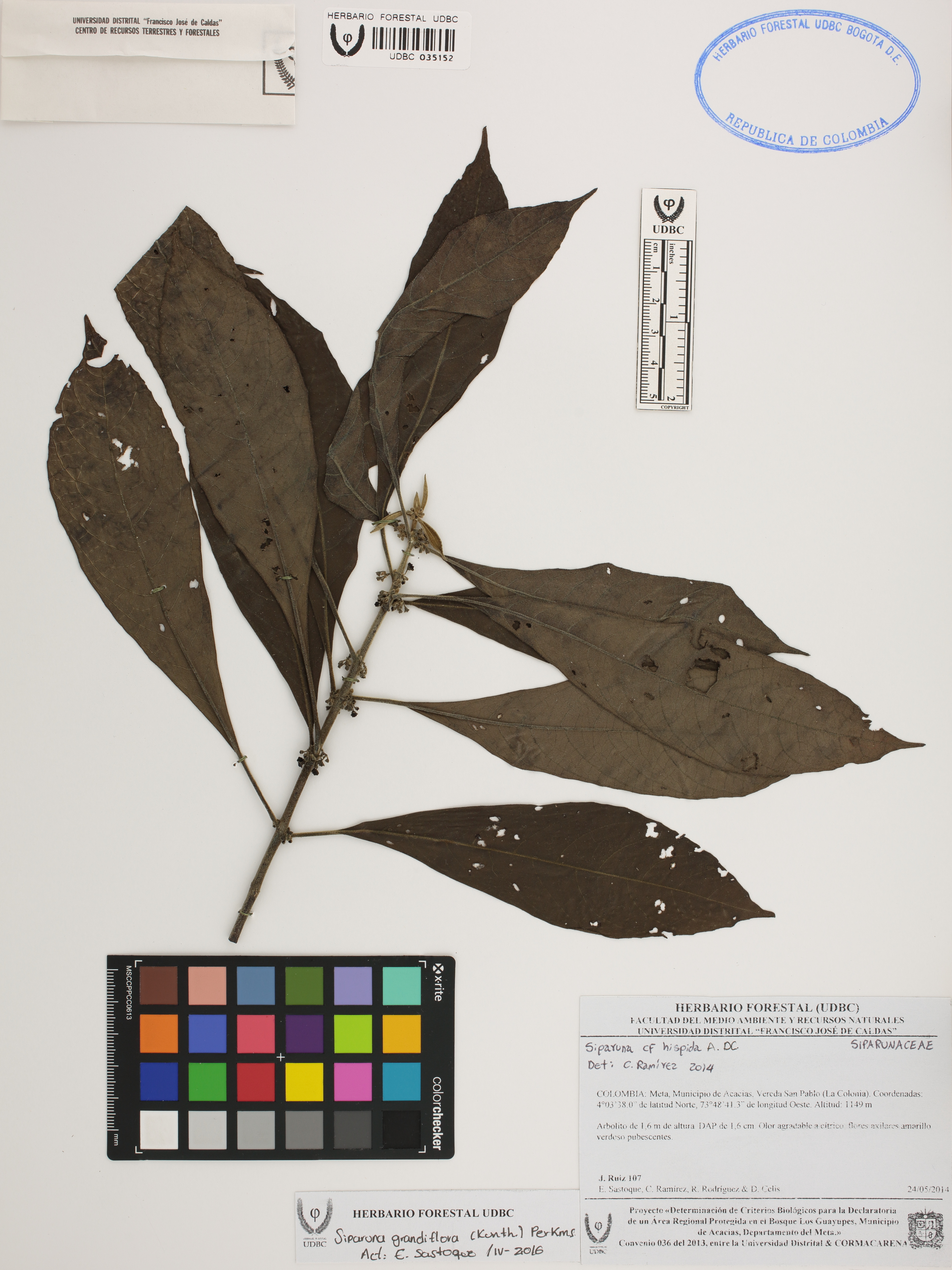 Fotografía del ejemplar Ruiz, J. 107, determinado como Siparuna grandiflora en el año 2016