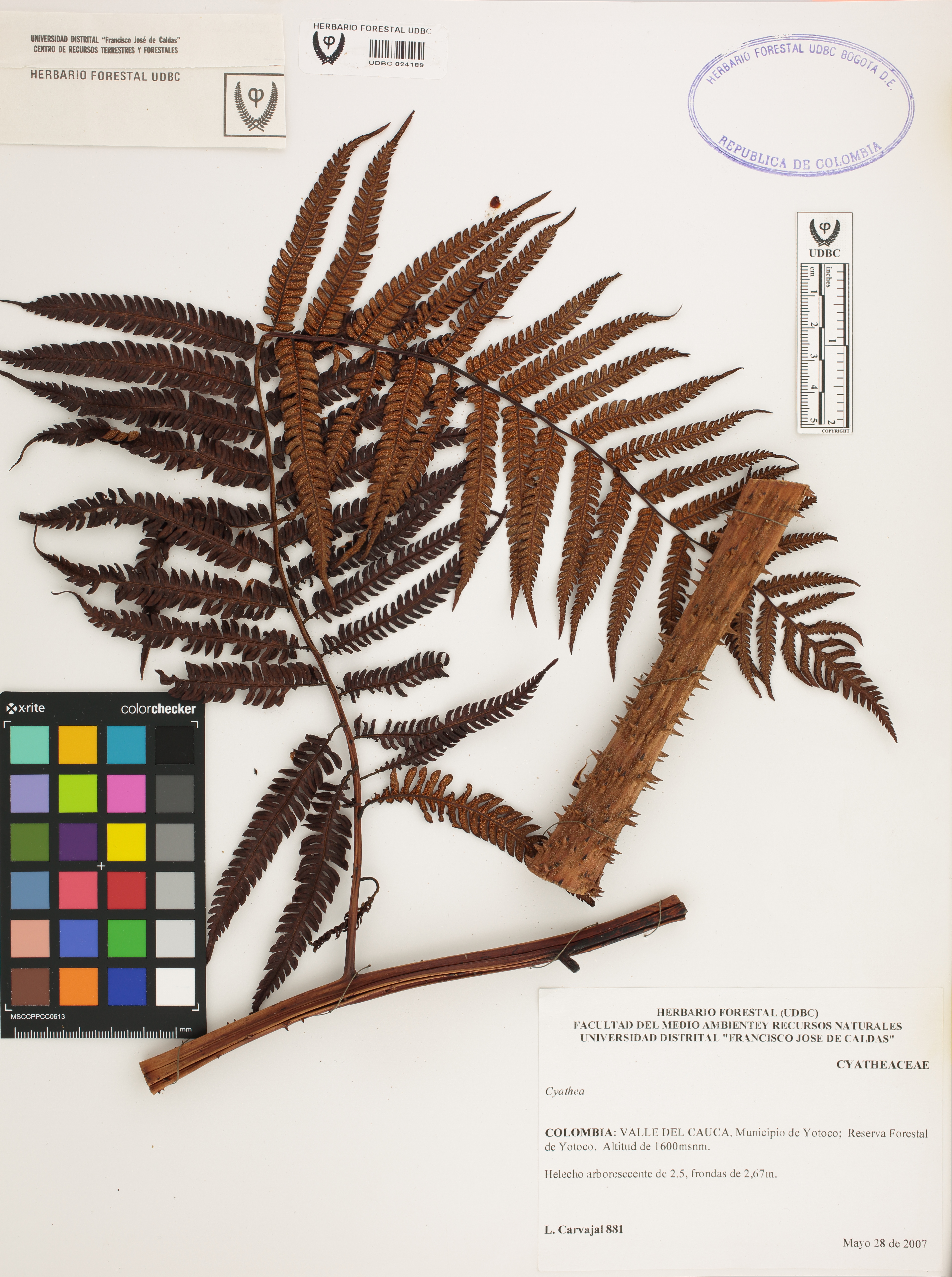 Fotografía del ejemplar Carvajal, L. 881, determinado como Cyathea sp.