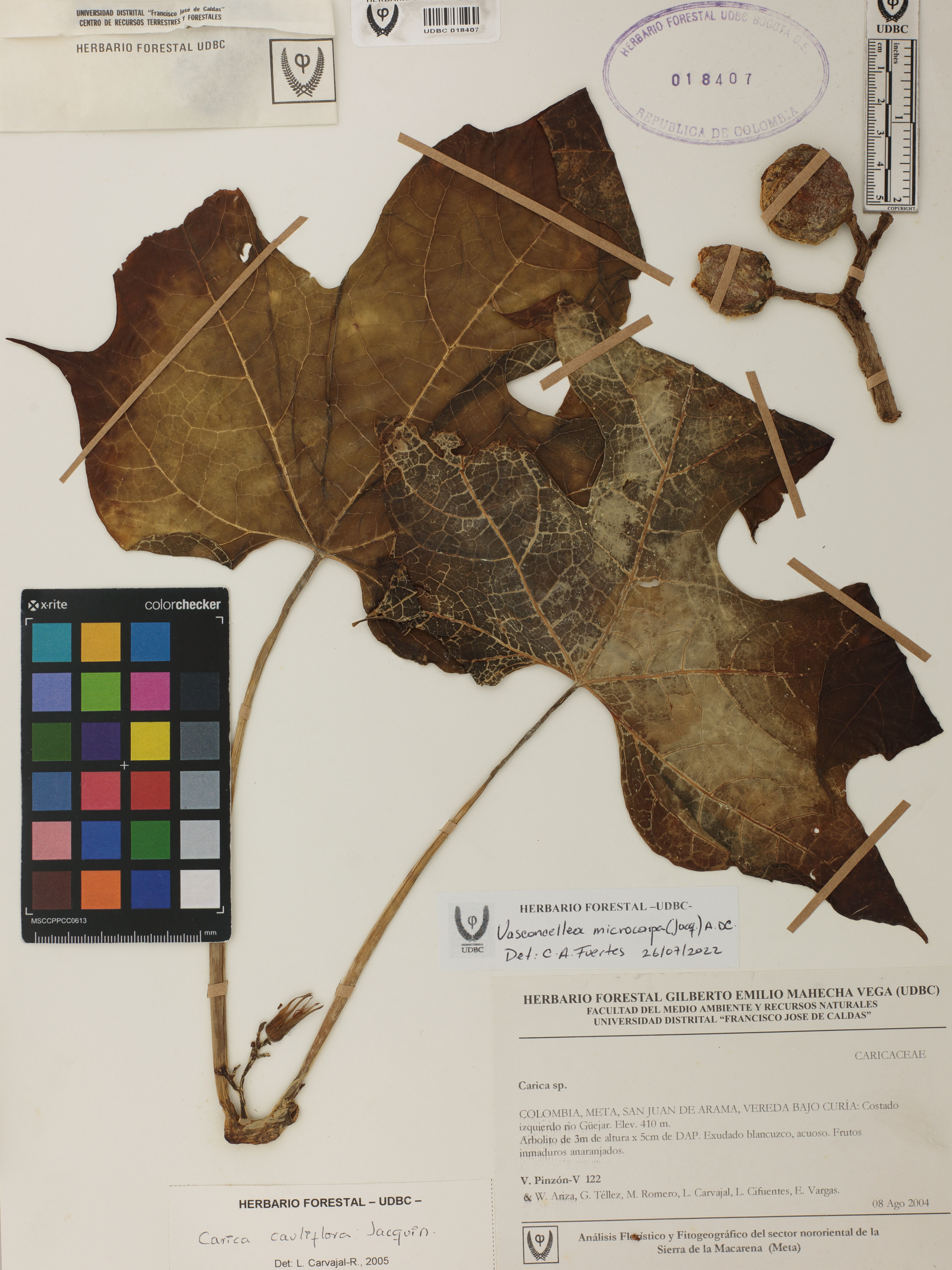 Fotografía del ejemplar Pinzón-V., V. 122, determinado como Vasconcellea microcarpa en el año 2022