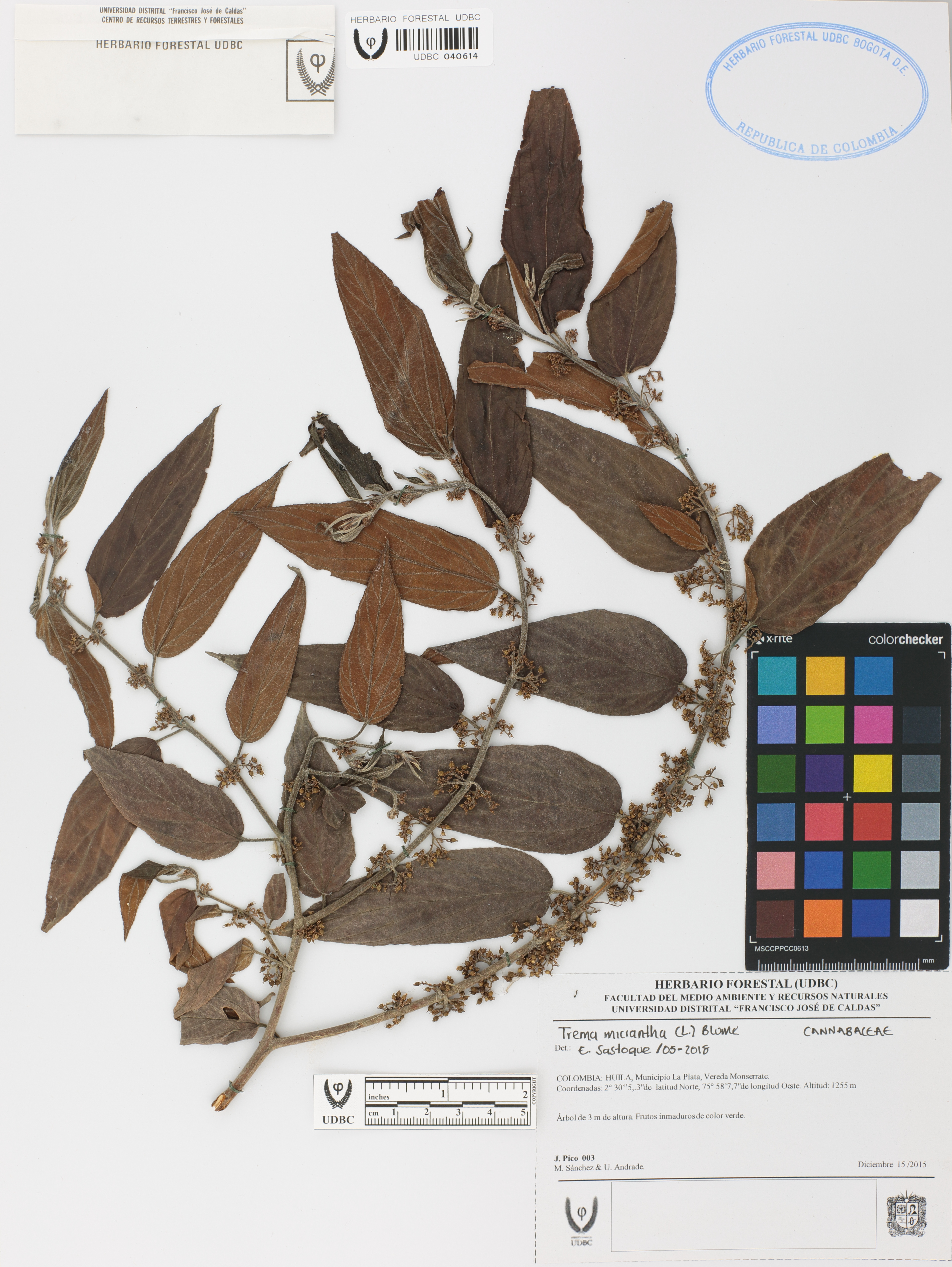 Fotografía del ejemplar Pico, J. 3, determinado como Trema micranthum en el año 2018