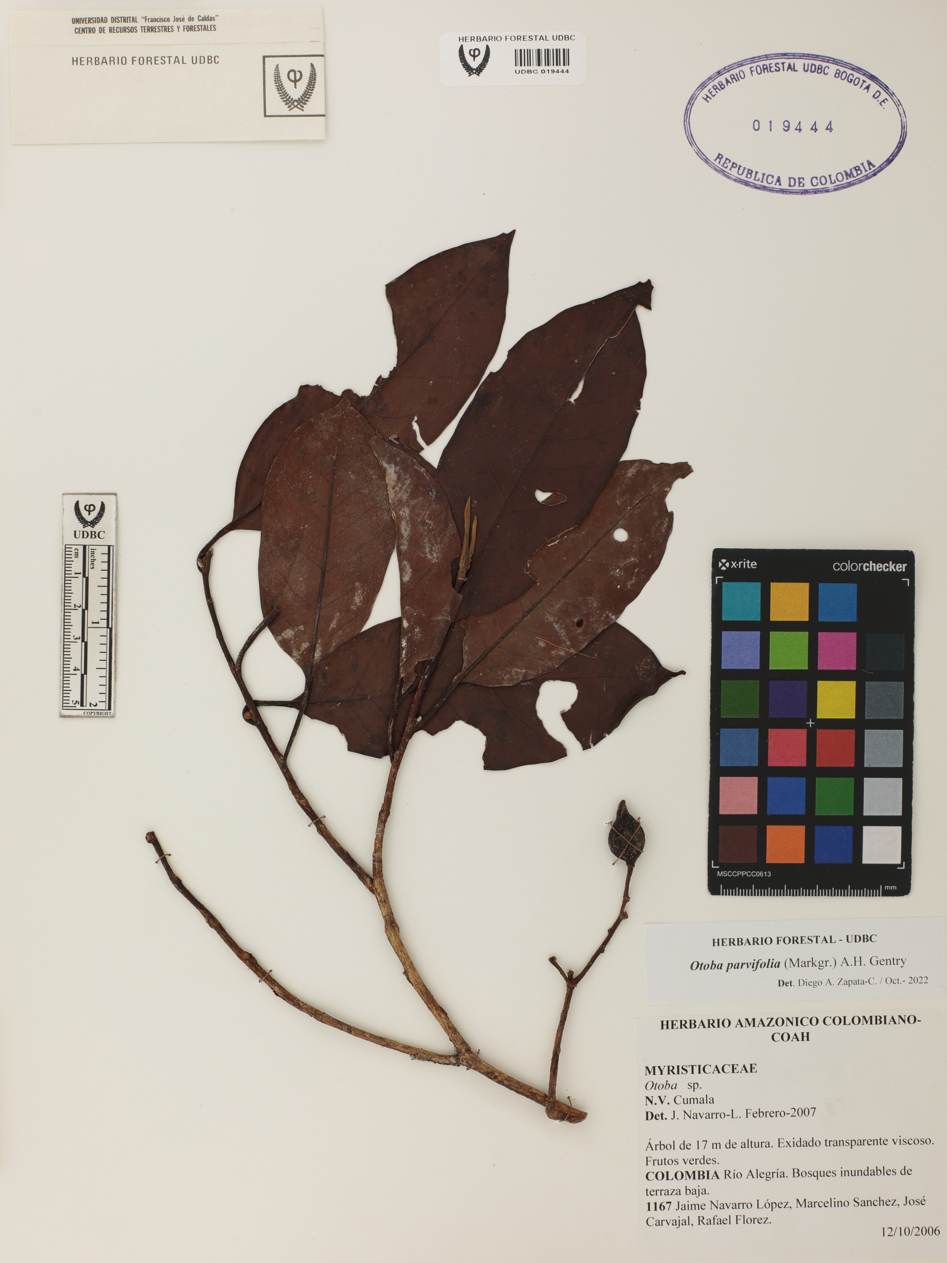 Fotografía del ejemplar Navarro-L., J. 1167, determinado como Otoba parvifolia en el año 2022