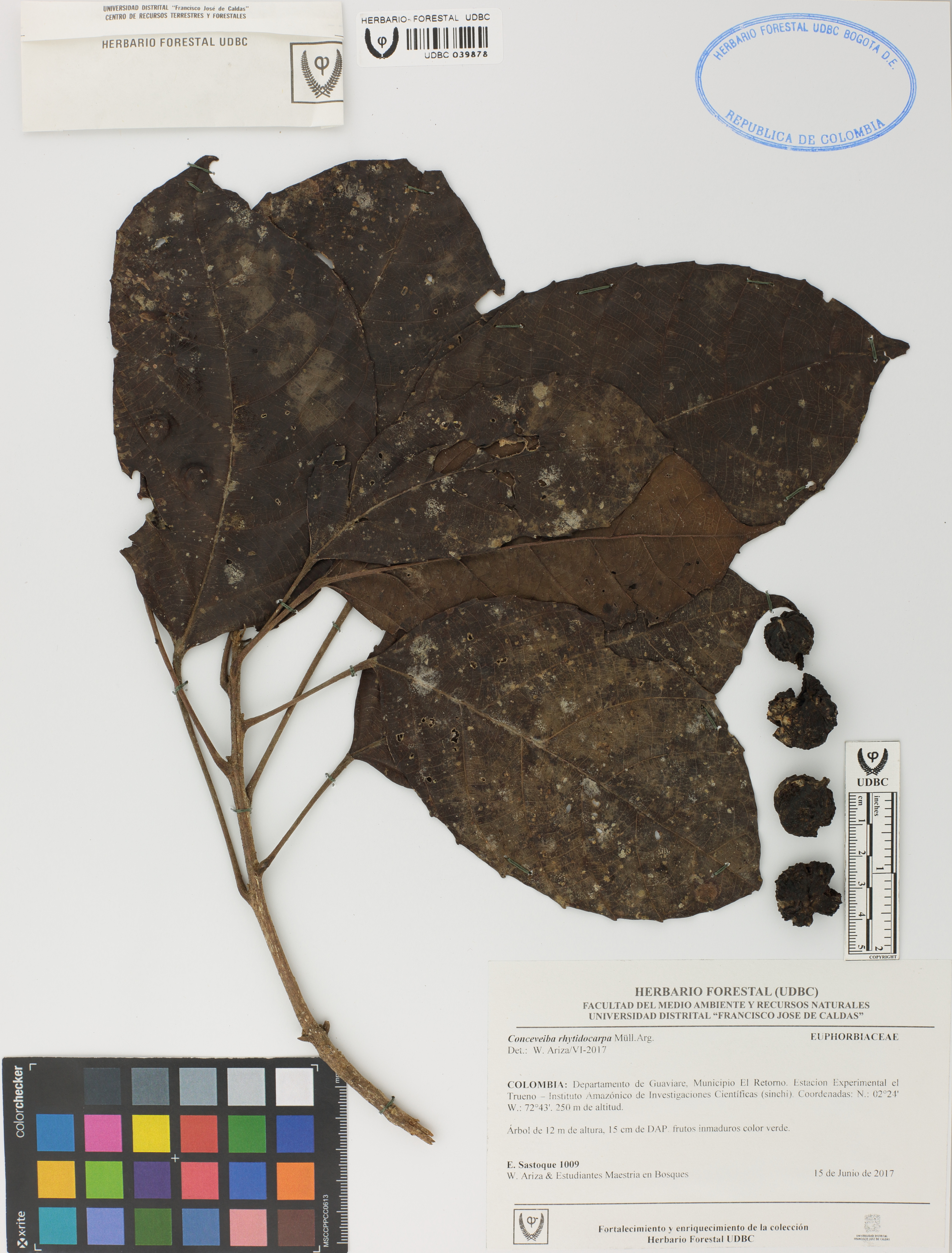 Fotografía del ejemplar Sastoque, E. 1009, determinado como Conceveiba rhytidocarpa en el año 2017