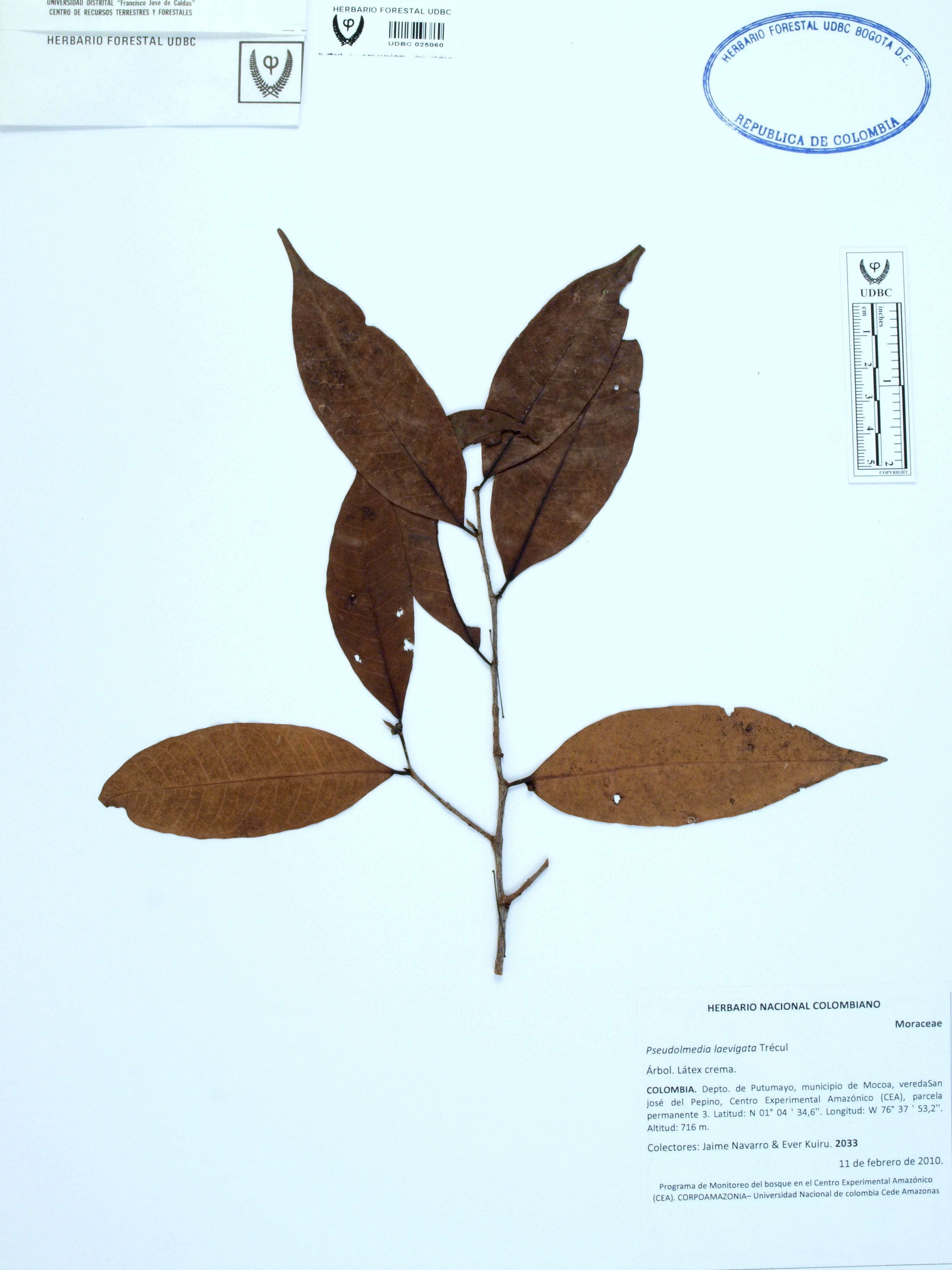 Fotografía del ejemplar Navarro, J. 2033, determinado como Pseudolmedia laevigata