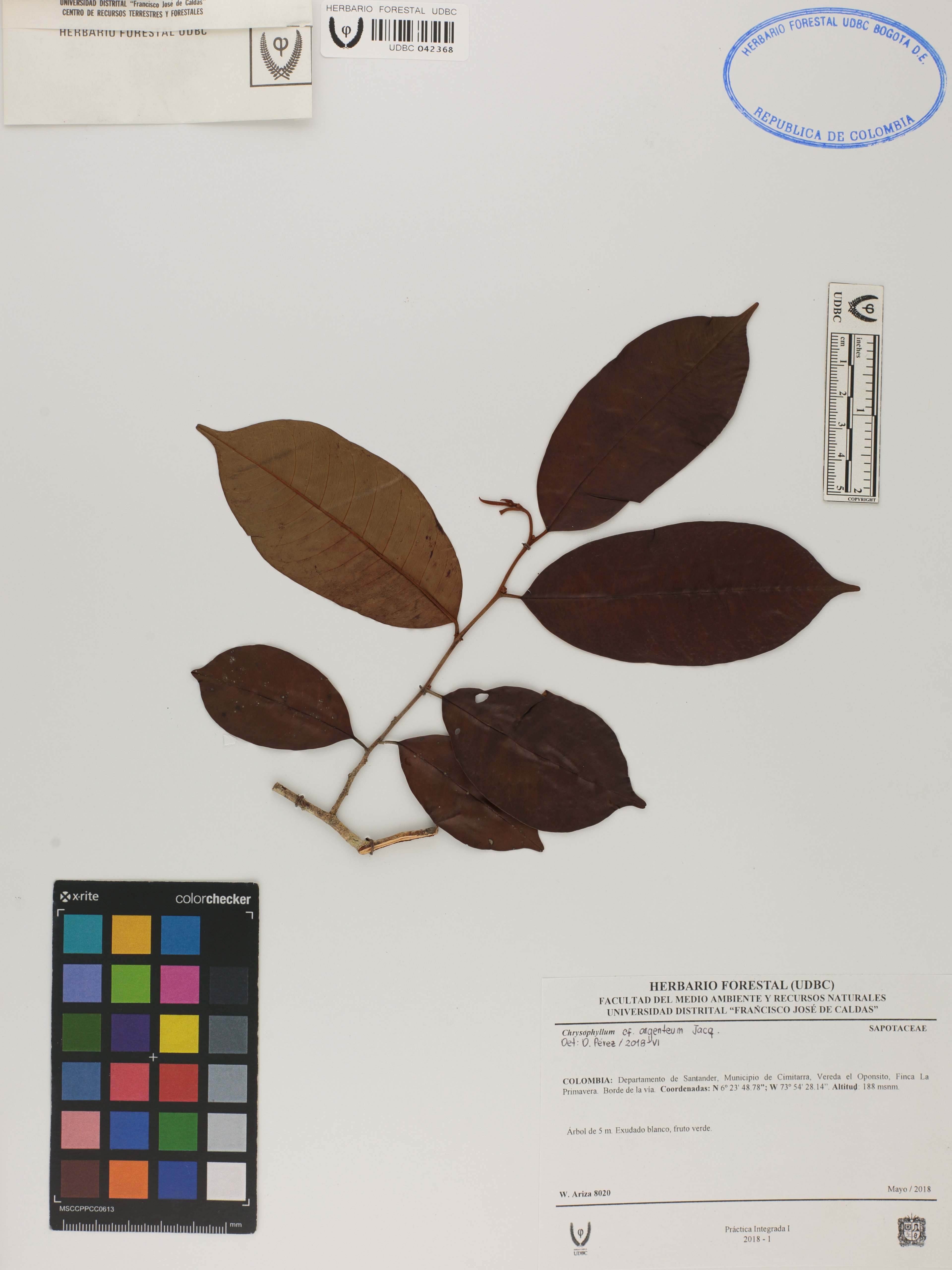Fotografía del ejemplar Ariza, W. 8020, determinado como Chrysophyllum argenteum en el año 2018