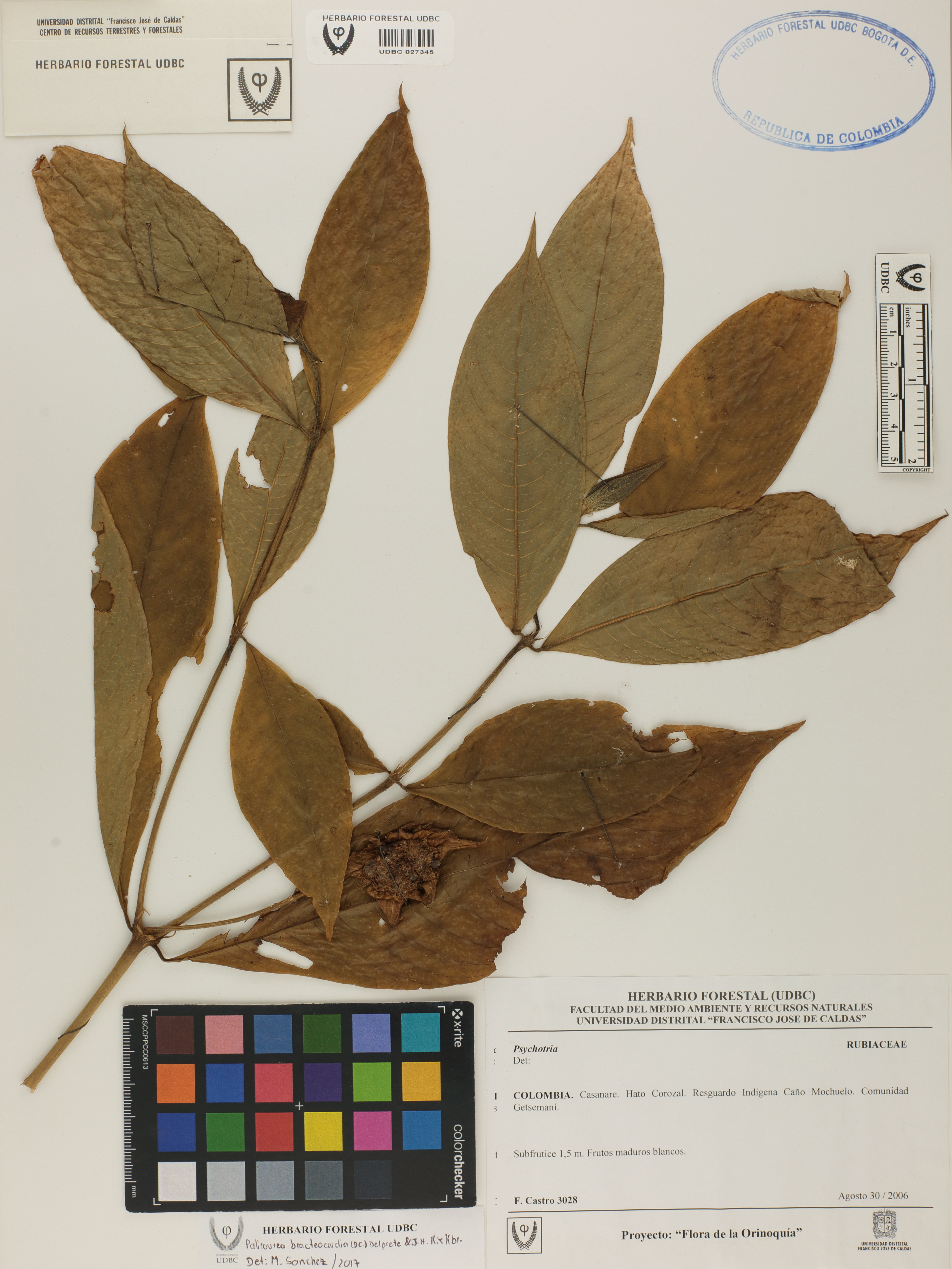 Fotografía del ejemplar Castro, F. 3028, determinado como Palicourea bracteocardia en el año 2017