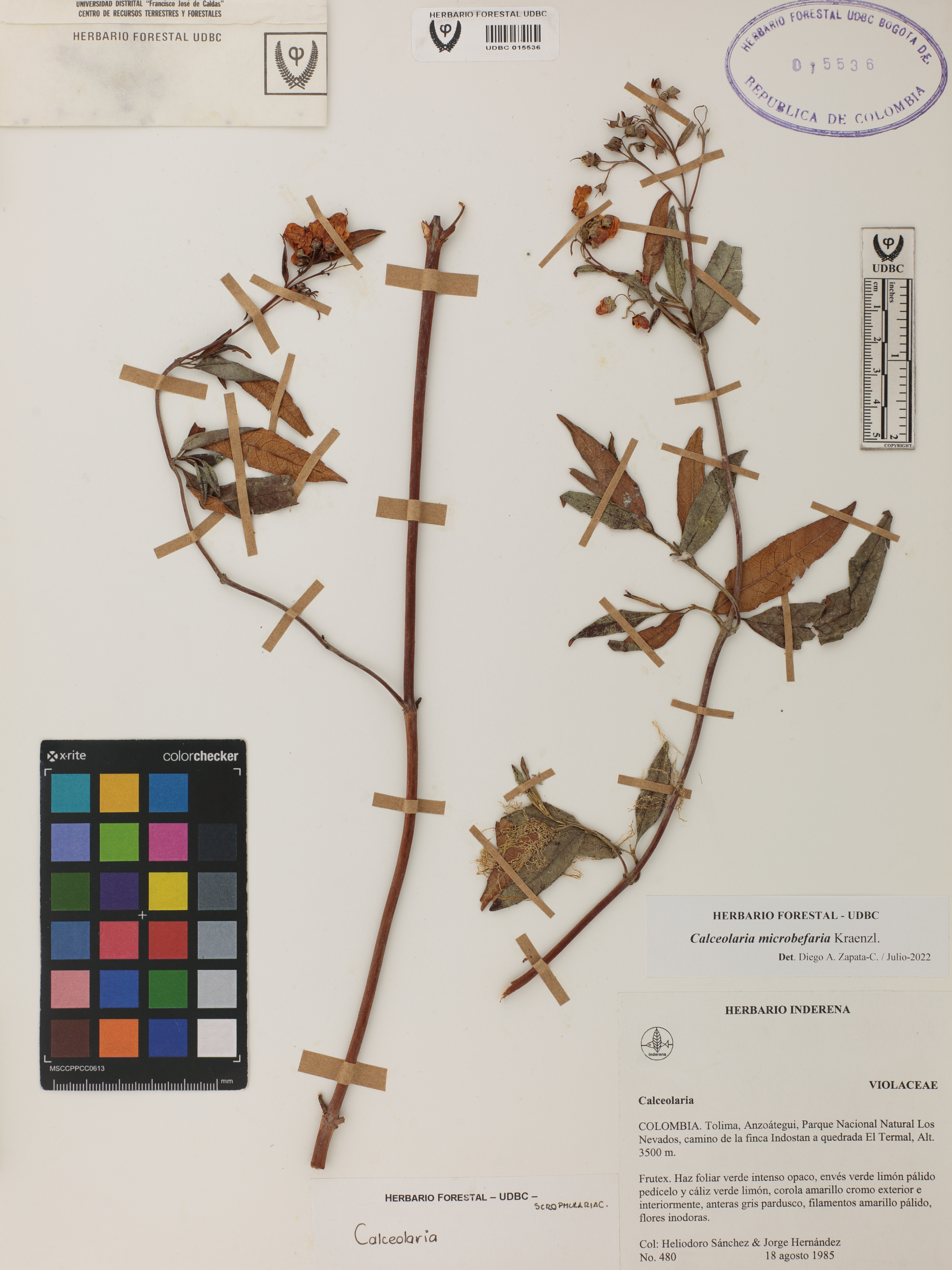 Fotografía del ejemplar Sánchez, H. 480, determinado como Calceolaria microbefaria en el año 2022