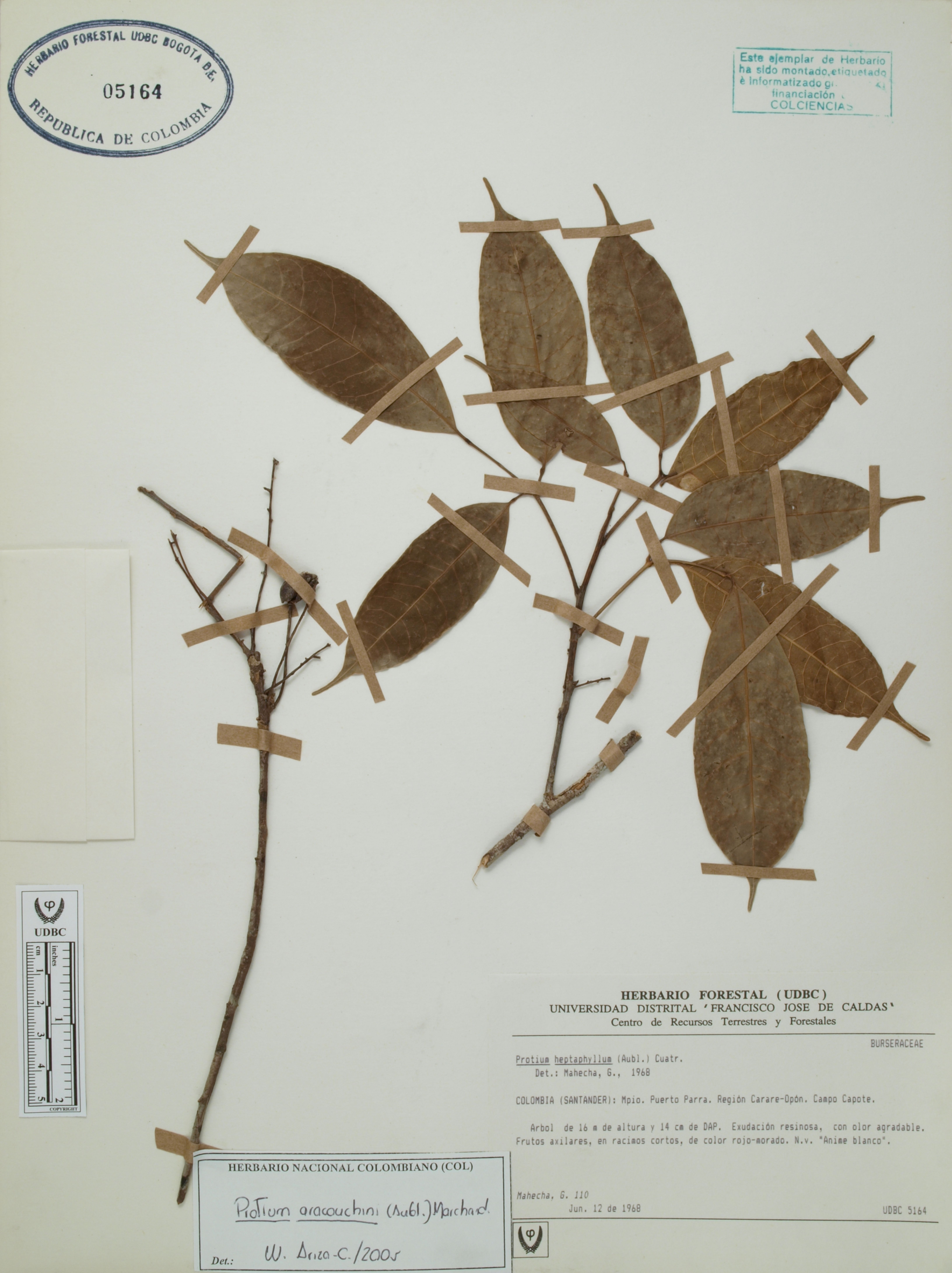 Fotografía del ejemplar Mahecha, G. 110, determinado como Protium aracouchini en el año 2005