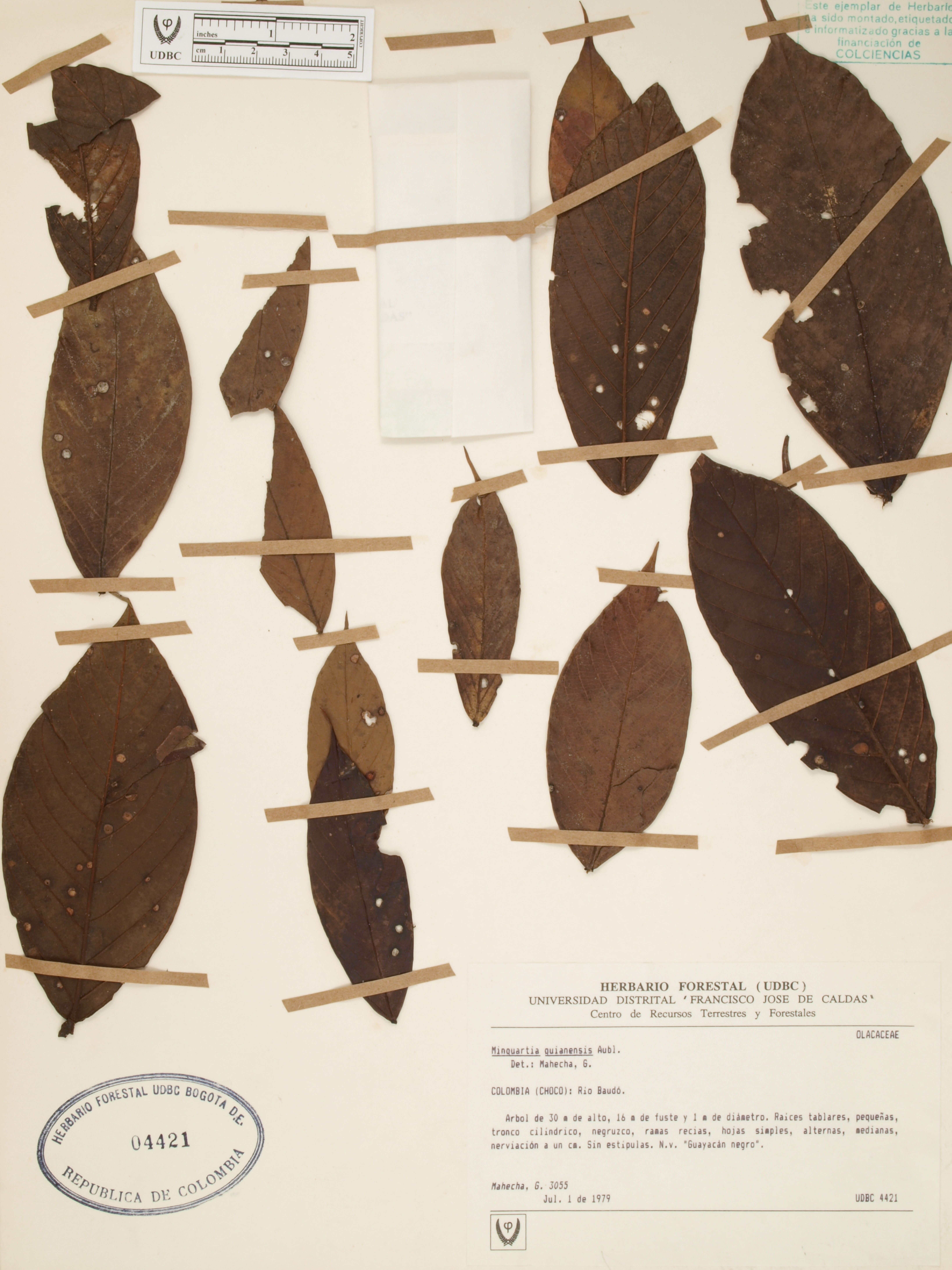 Fotografía del ejemplar Mahecha, G. 3055, determinado como Minquartia guianensis