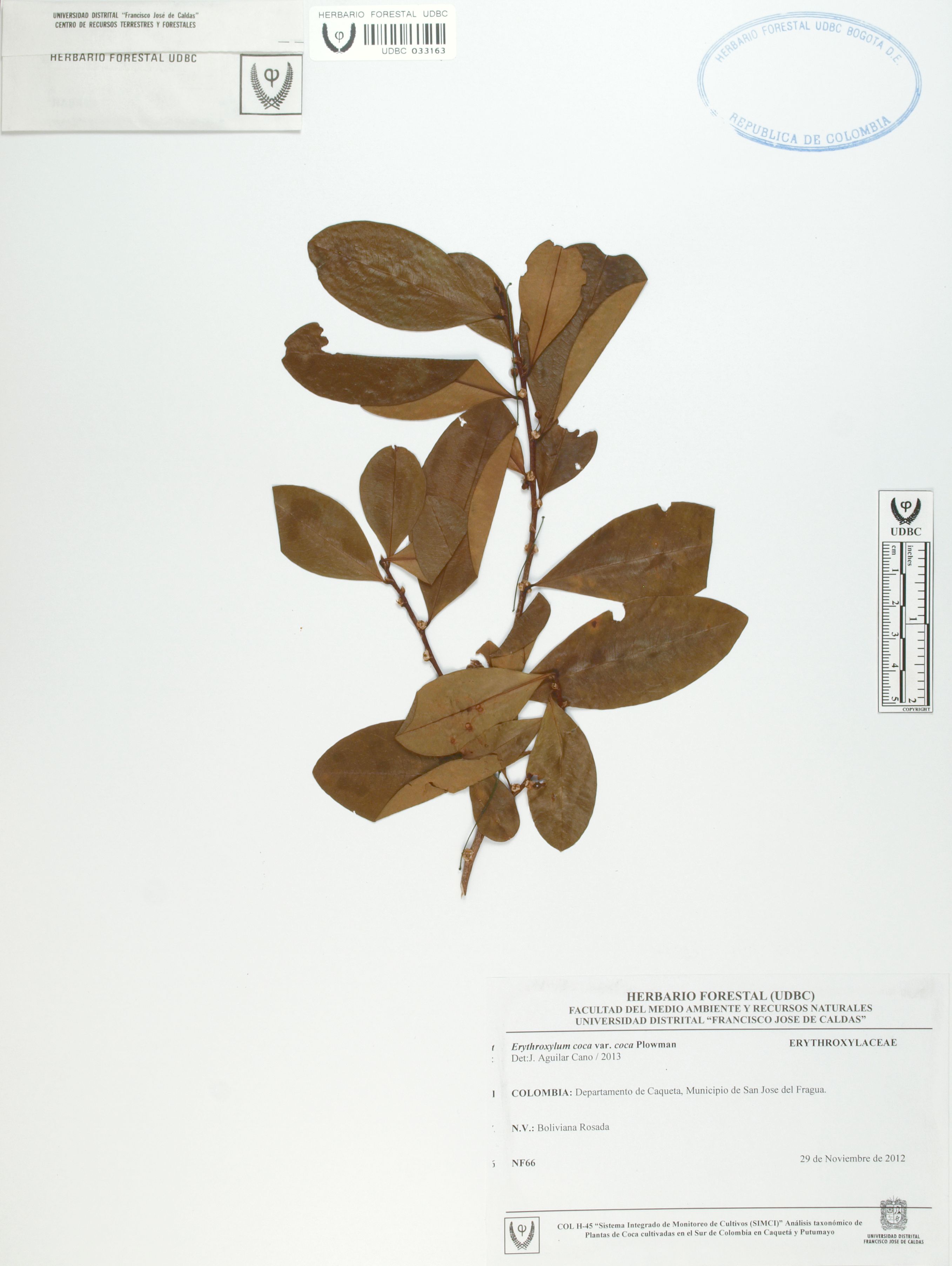 Fotografía del ejemplar SD 66, determinado como Erythroxylum coca var. coca en el año 2013