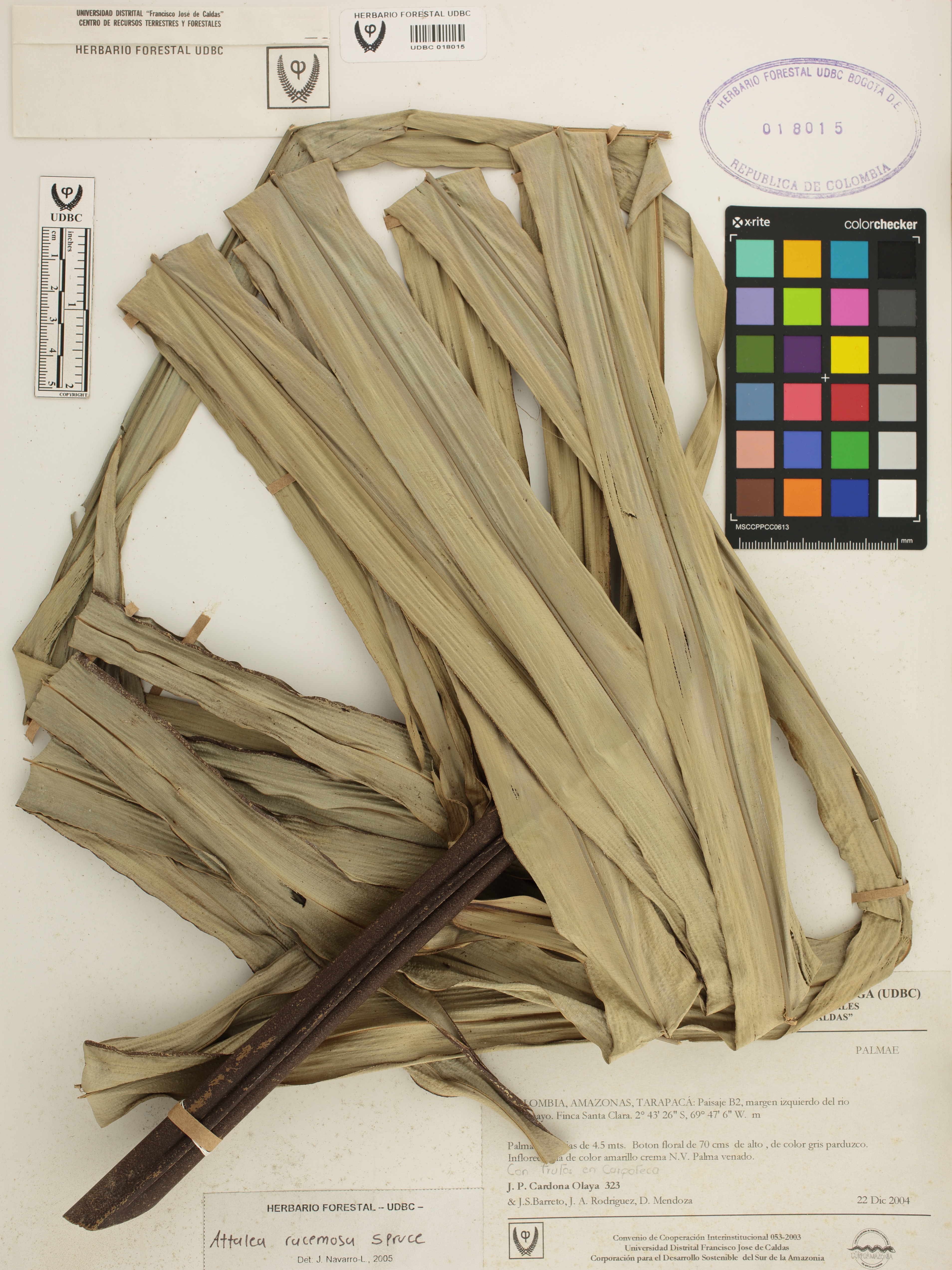 Fotografía del ejemplar Cardona, J. 323, determinado como Attalea racemosa en el año 2005