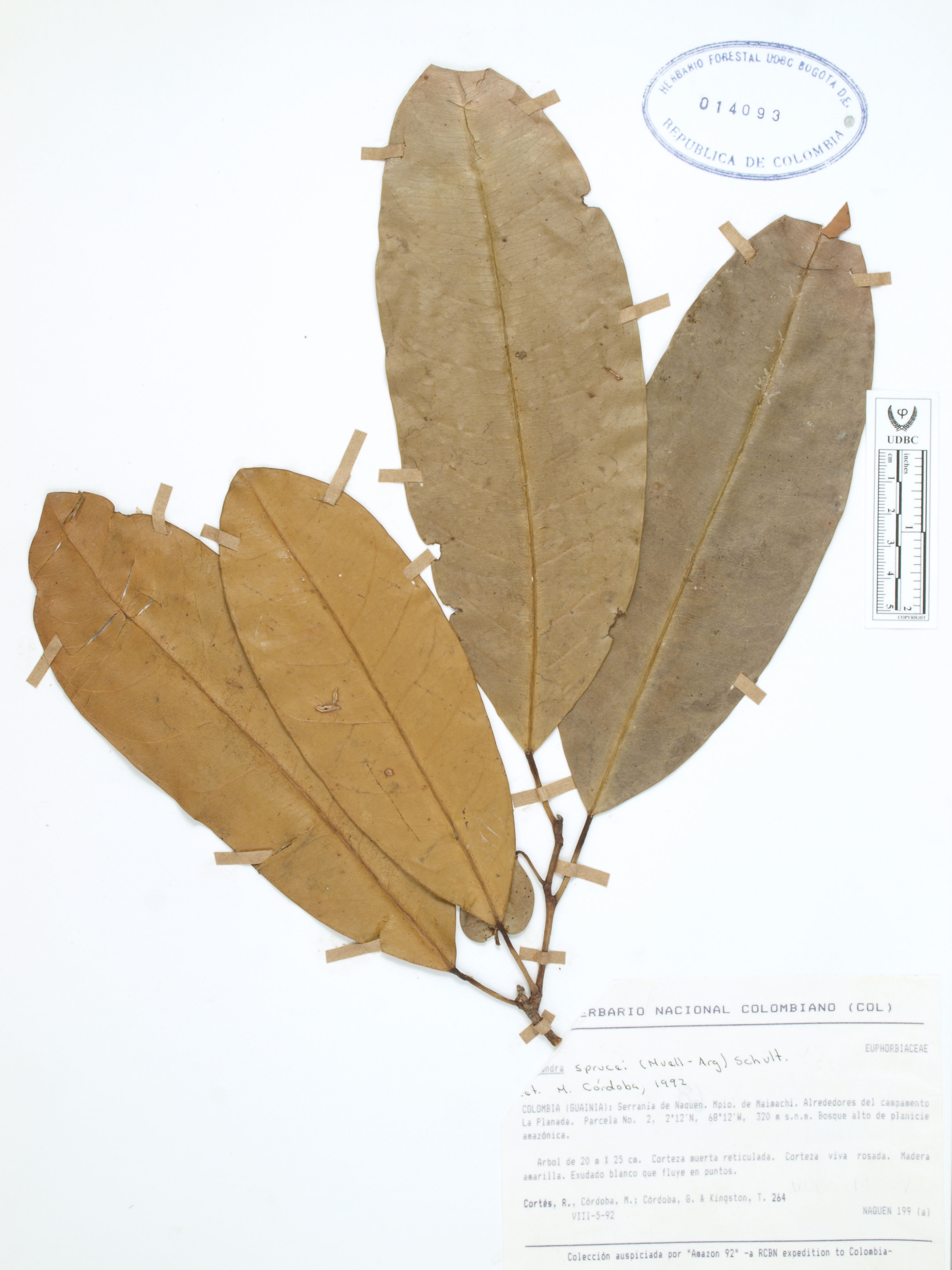 Fotografía del ejemplar Cortés-B., R. 264, determinado como Micrandra sprucei en el año 1992