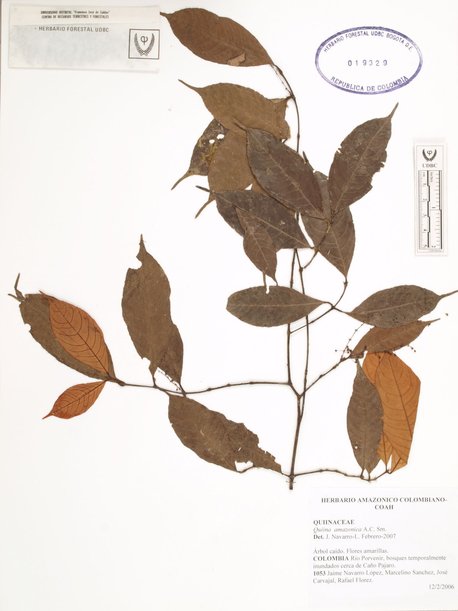 Fotografía del ejemplar Navarro, J. 1053, determinado como Quiina amazonica en el año 2007