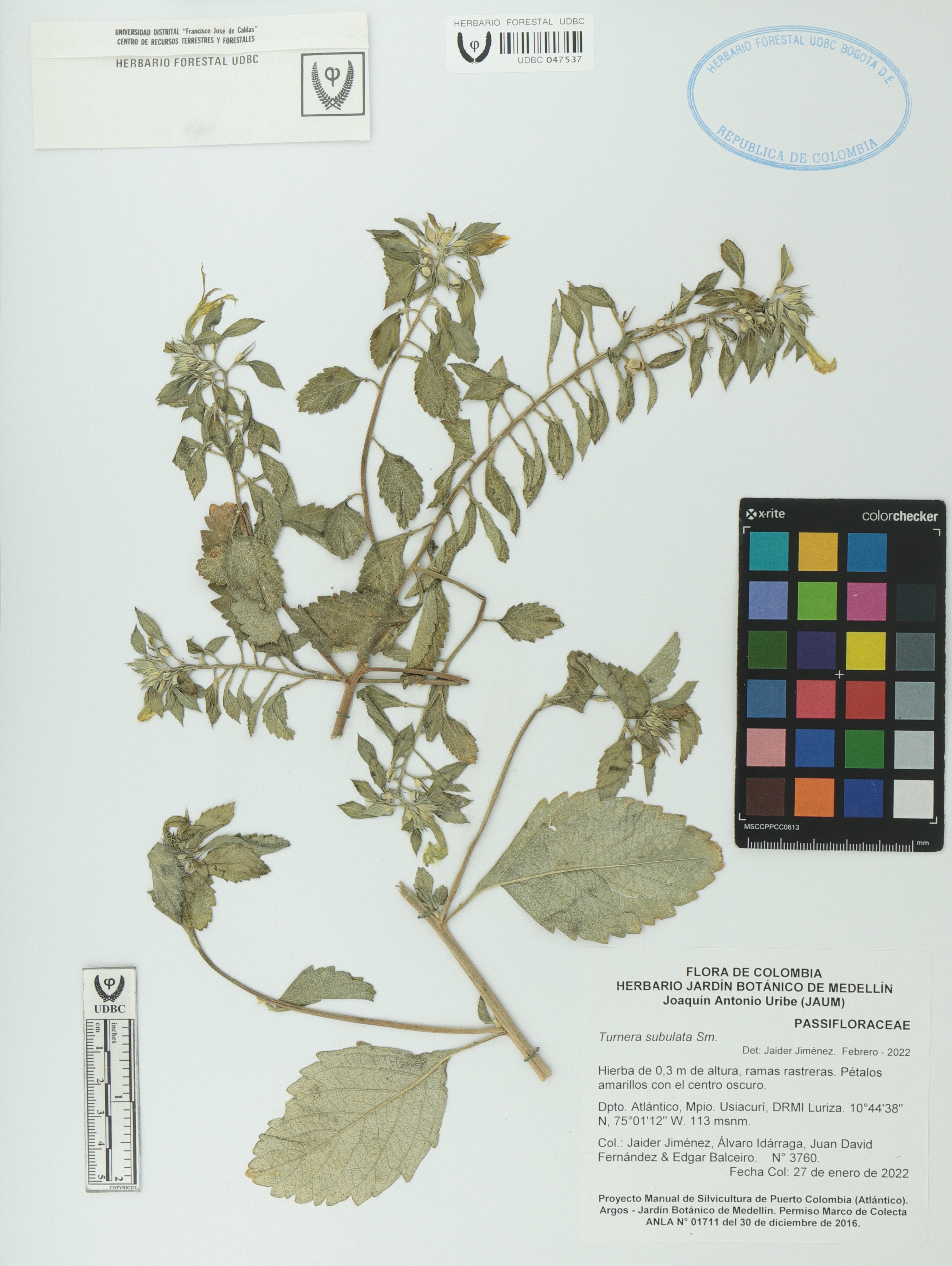 Fotografía del ejemplar Jiménez, J. 3760, determinado como Turnera subulata en el año 2022