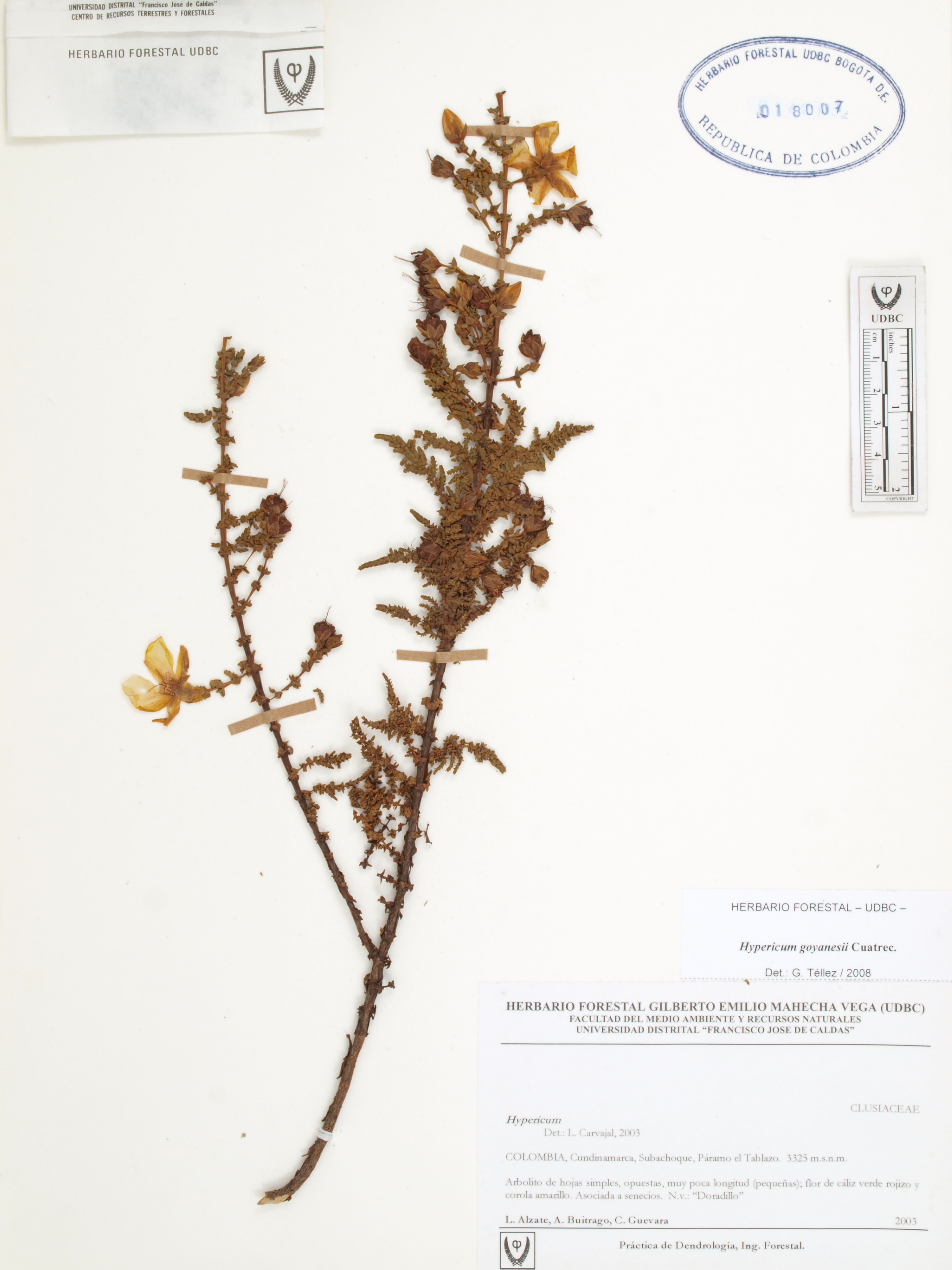 Fotografía del ejemplar Alzate, L., determinado como Hypericum goyanesii en el año 2008