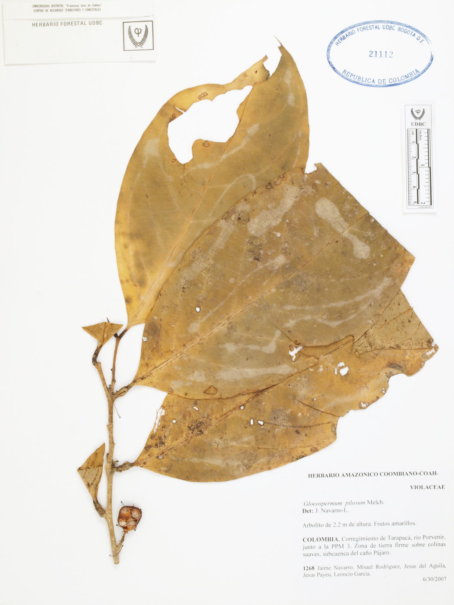 Fotografía del ejemplar Navarro, J. 1268, determinado como Gloeospermum pilosum en el año 2007