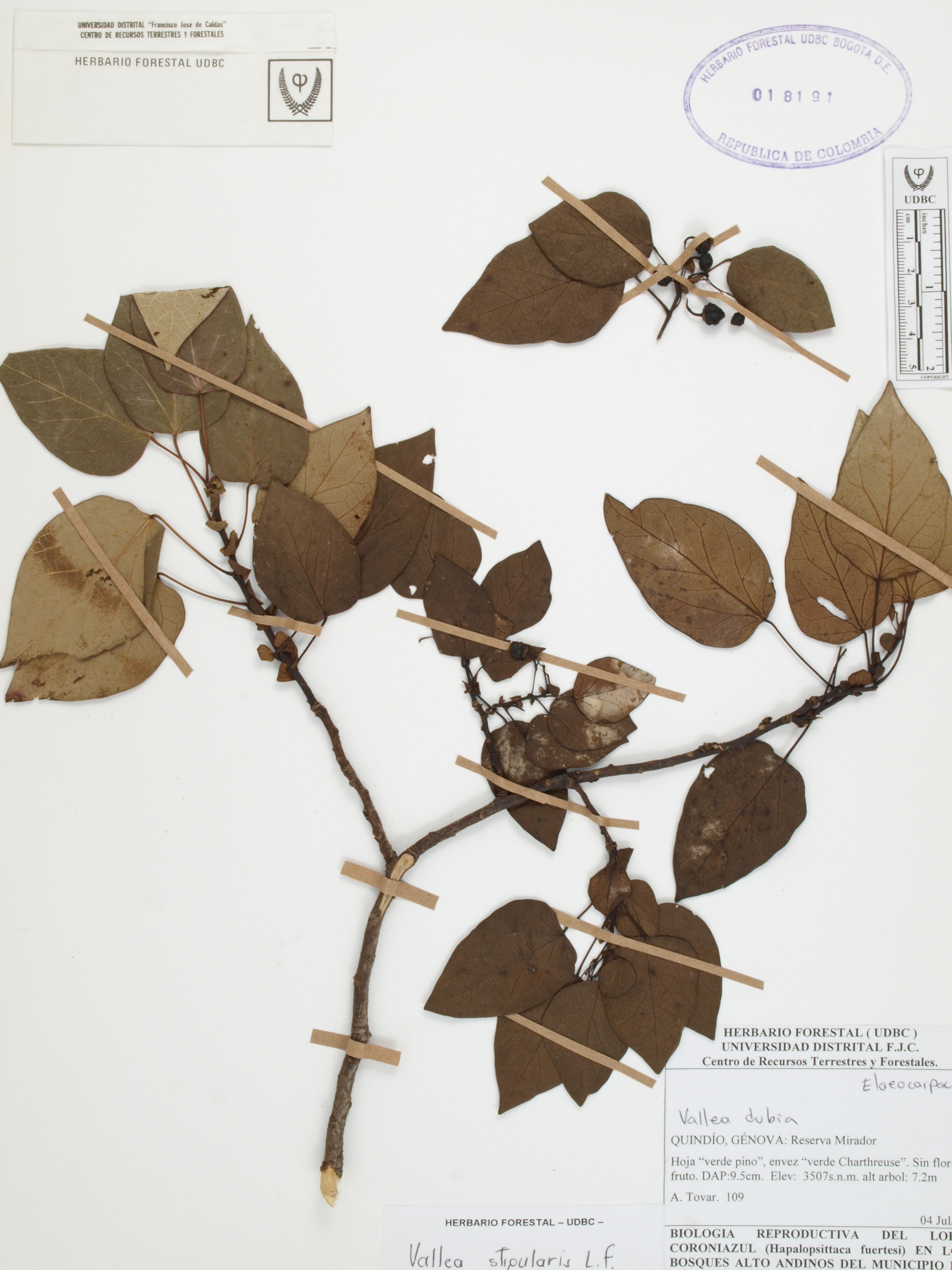 | dc.description | Fotografía del ejemplar Tovar, A. 109, determinado como Vallea stipularis en el año 2006 | |