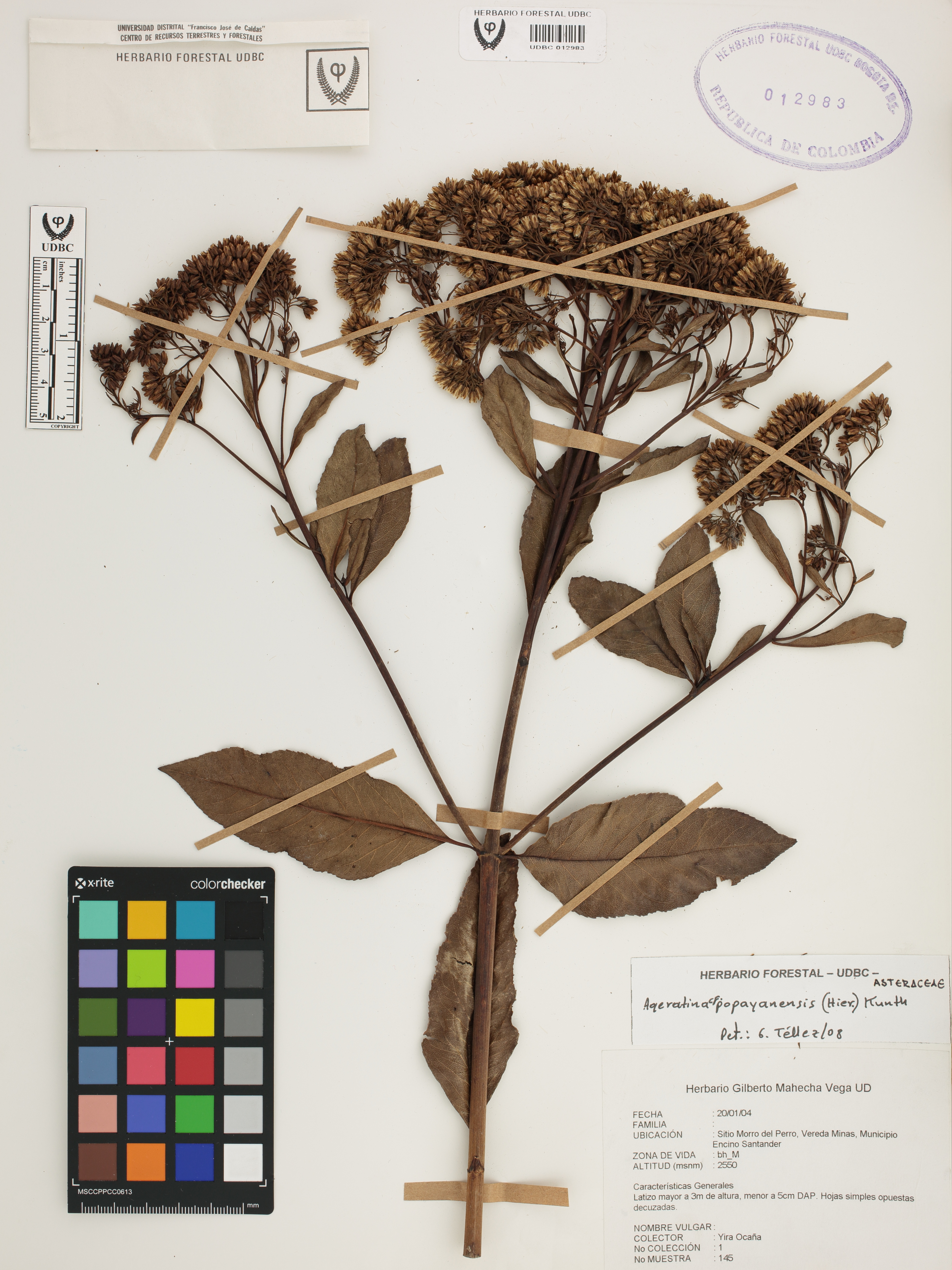 Fotografía del ejemplar Ocaña, Y. 145, determinado como Ageratina popayanensis en el año 2008