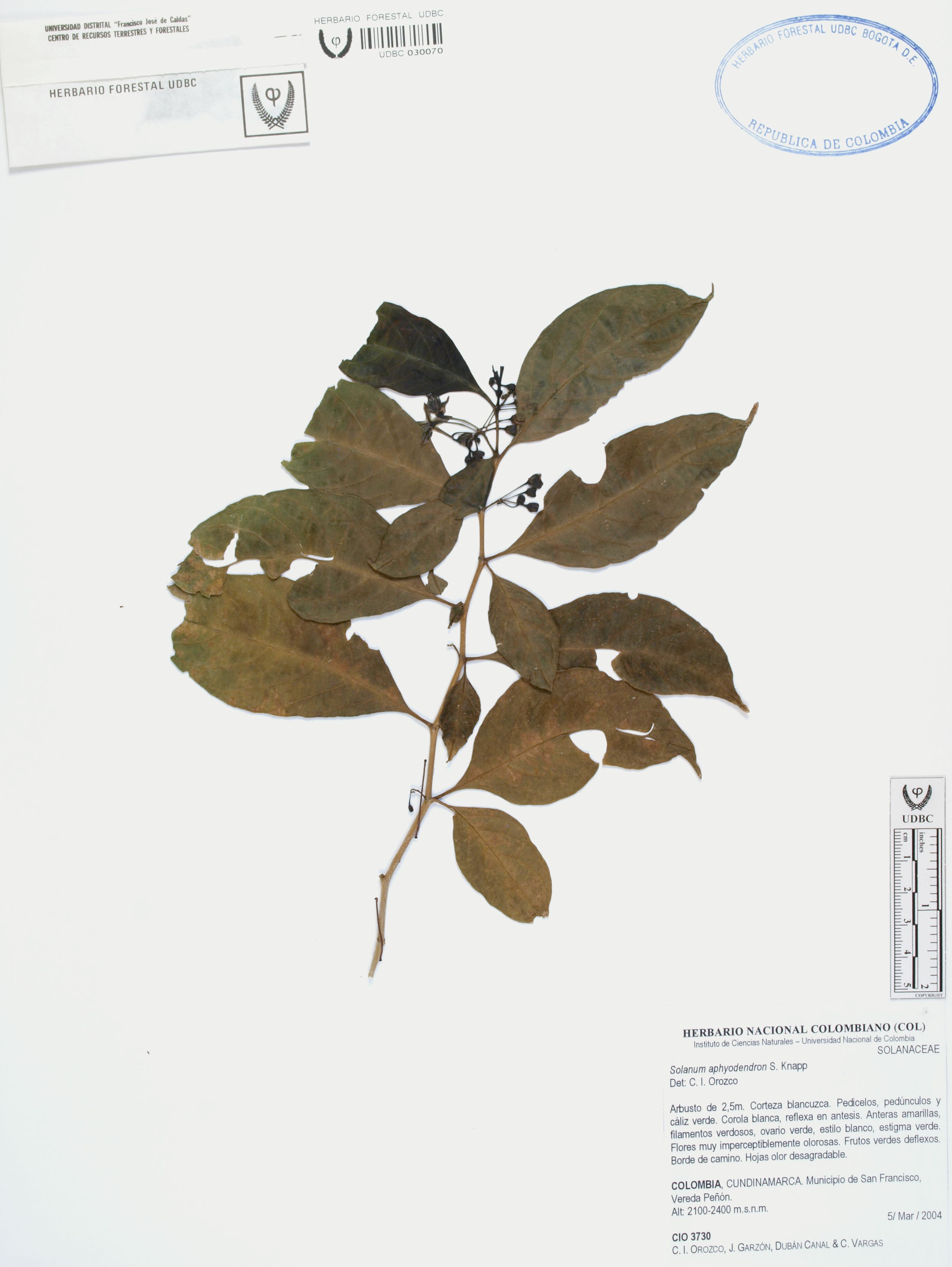 | dc.description | Fotografía del ejemplar Orozco, C. 3730, determinado como Solanum aphyodendron | |