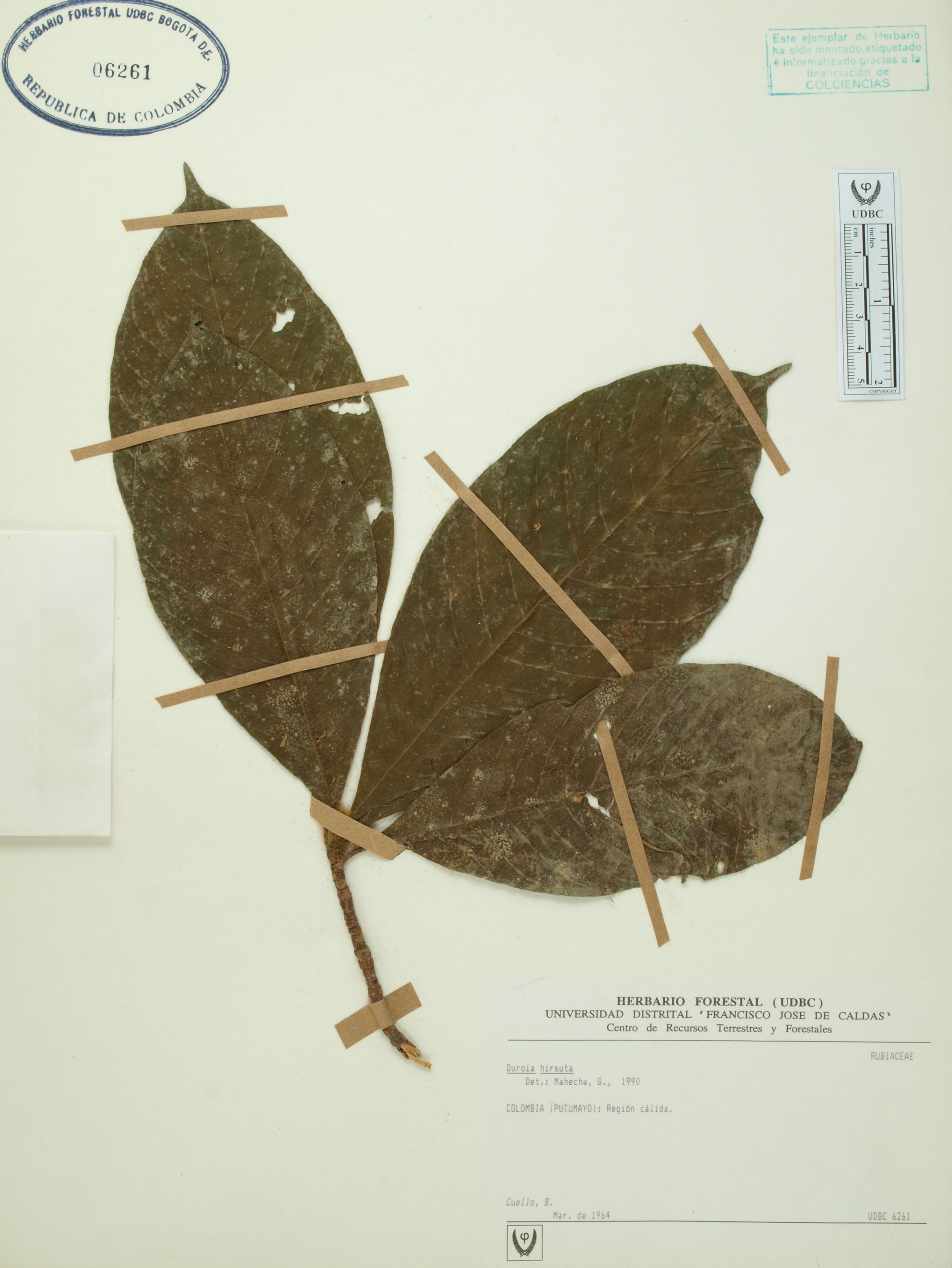 Fotografía del ejemplar Cuello, B., determinado como Duroia hirsuta en el año 1990