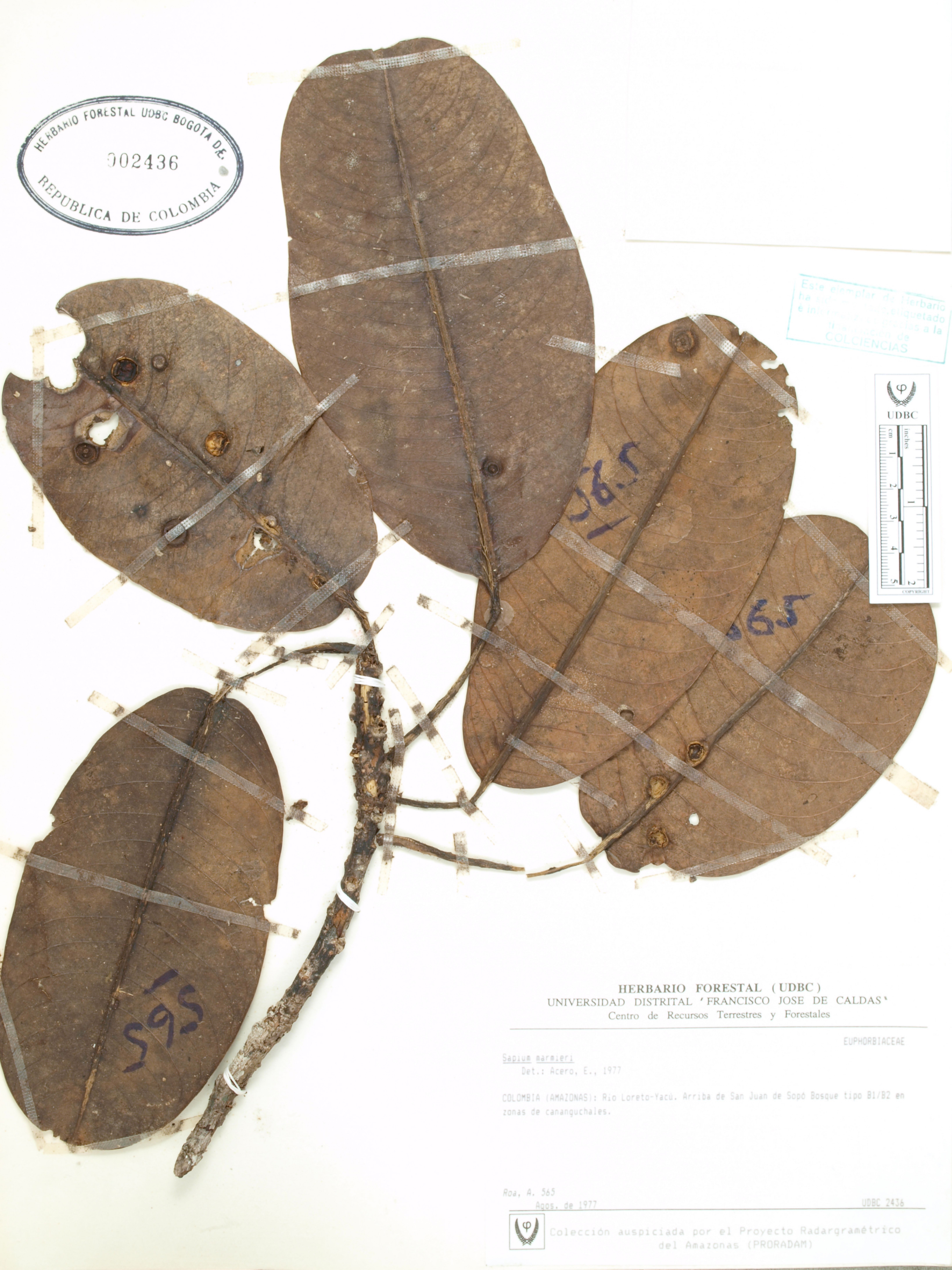 Fotografía del ejemplar Roa, A. 565, determinado como Sapium marmieri en el año 1977