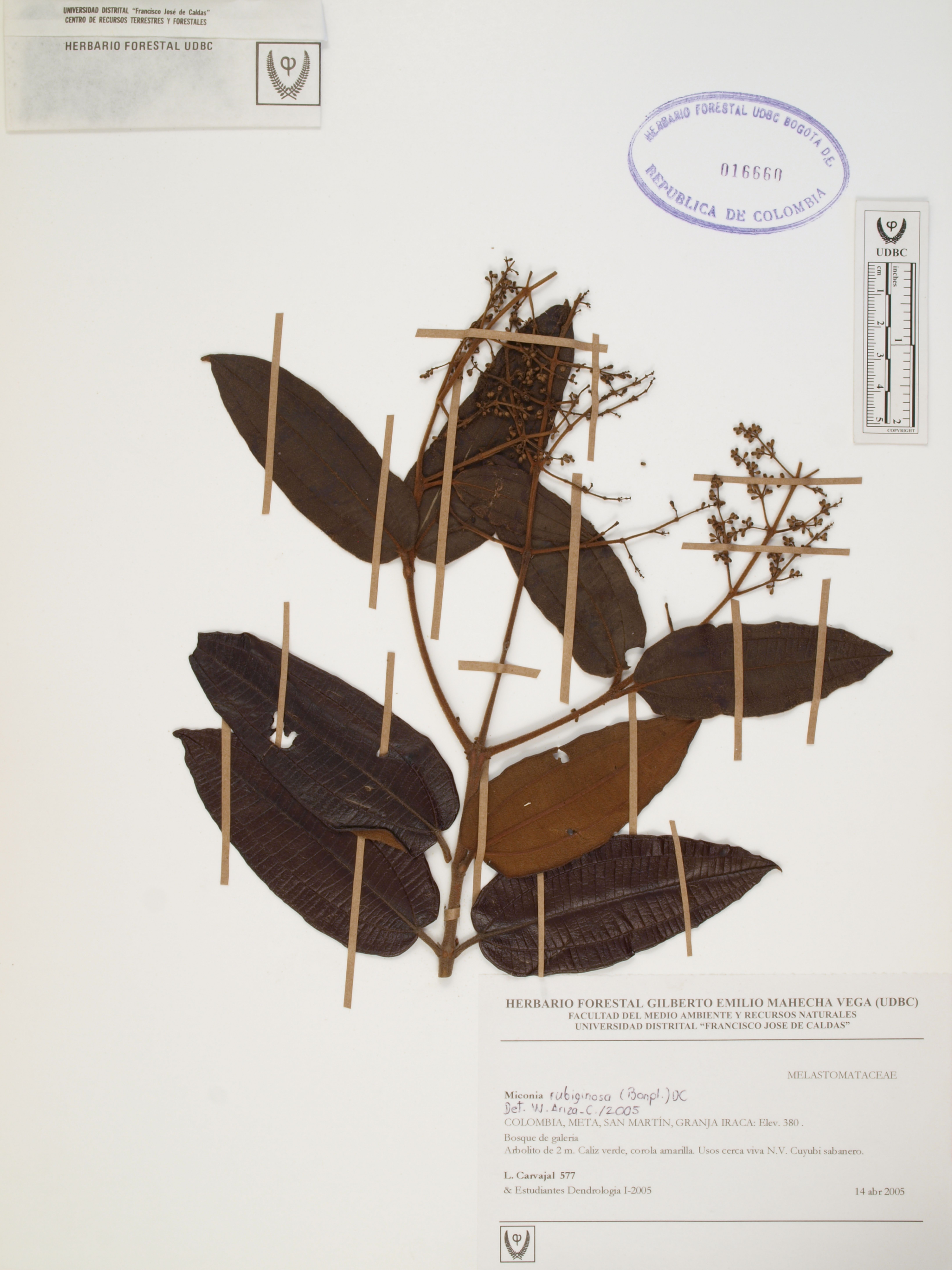 Fotografía del ejemplar Carvajal, L. 557, determinado como Miconia rubiginosa en el año 2005