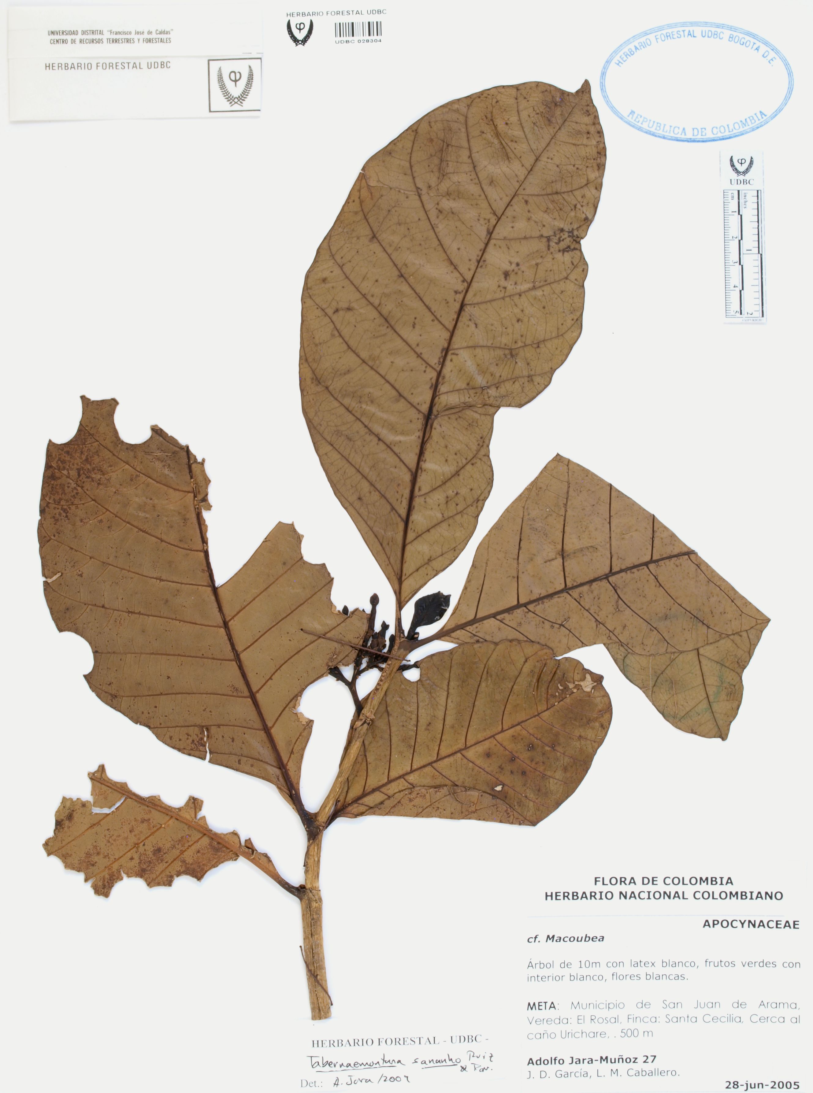 Fotografía del ejemplar Jara, A. 27, determinado como Tabernaemontana sananho en el año 2009