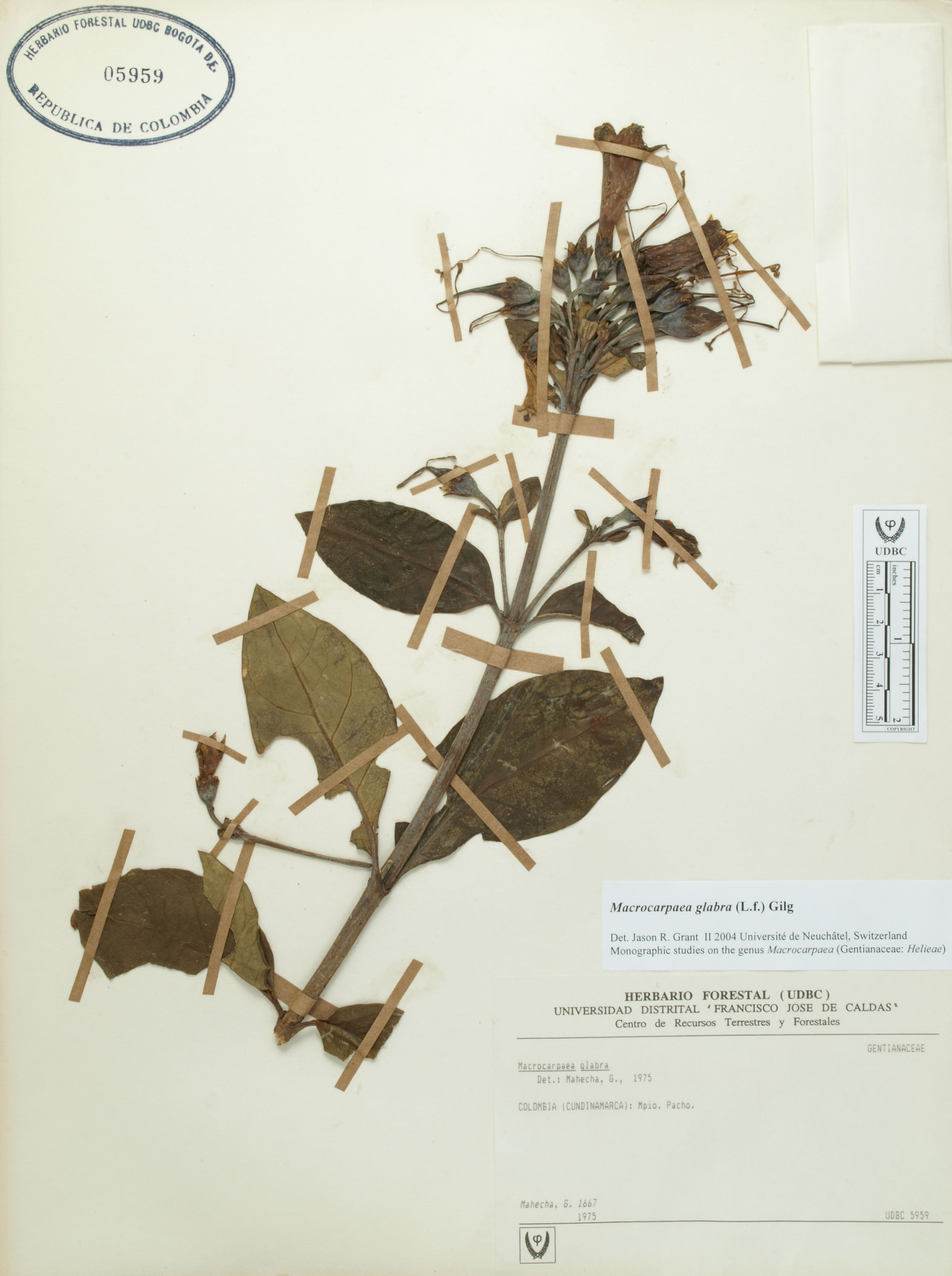 Fotografía del ejemplar Mahecha, G. 1667, determinado como Macrocarpaea glabra en el año 2004