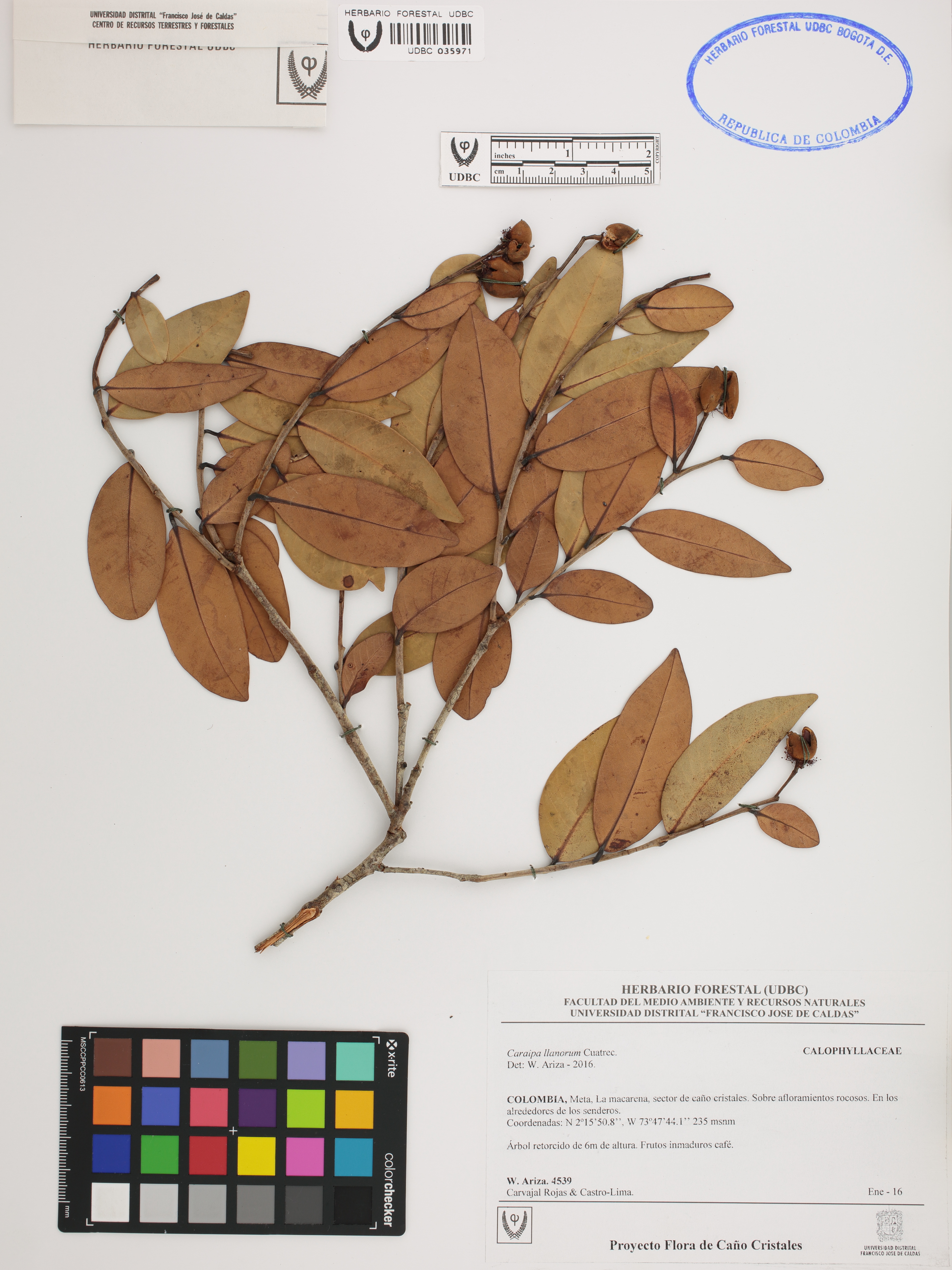 Fotografía del ejemplar Ariza, W. 4539, determinado como Caraipa llanorum en el año 2016