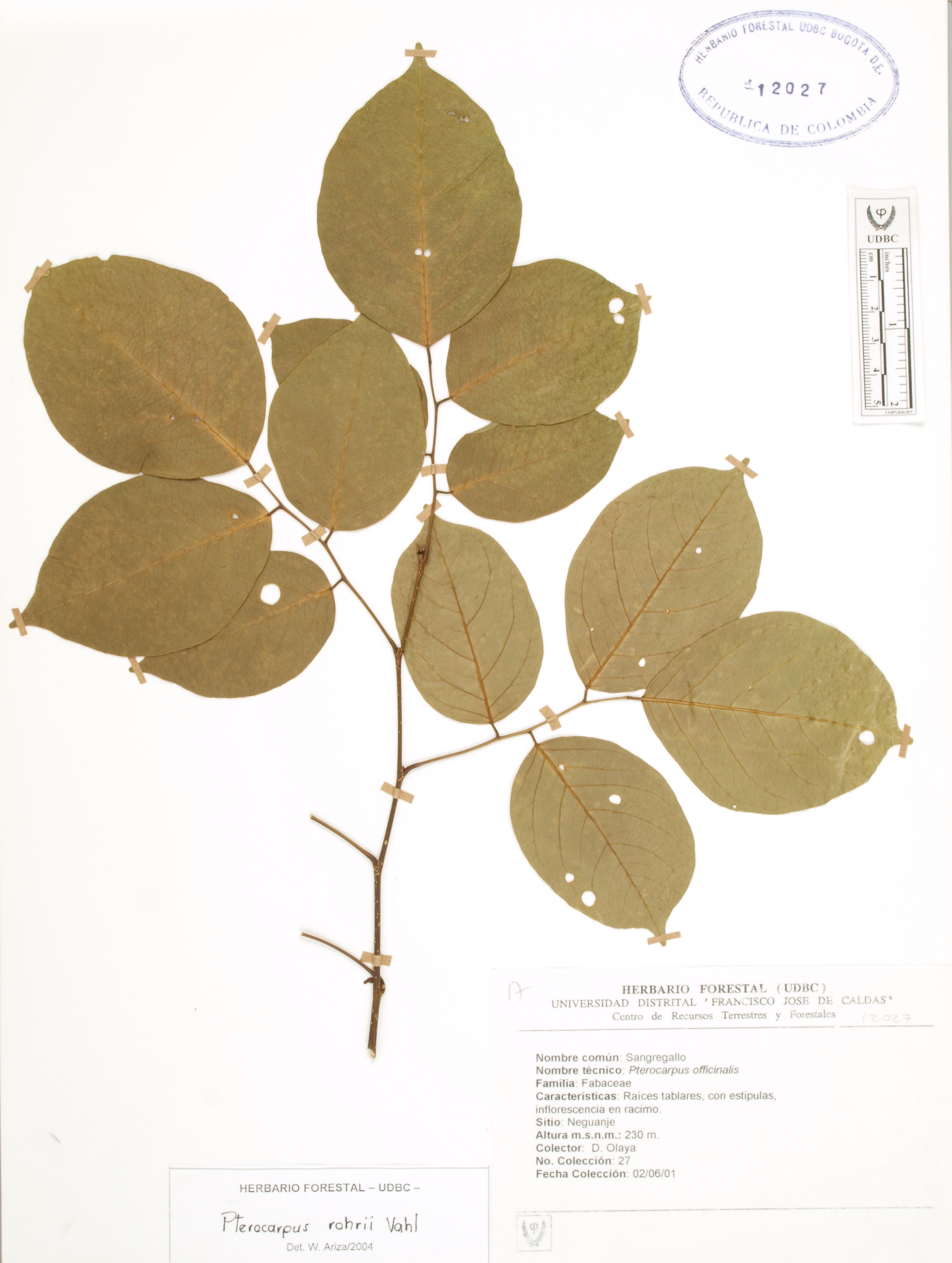 Fotografía del ejemplar Olaya, D. 27, determinado como Pterocarpus rohrii en el año 2004
