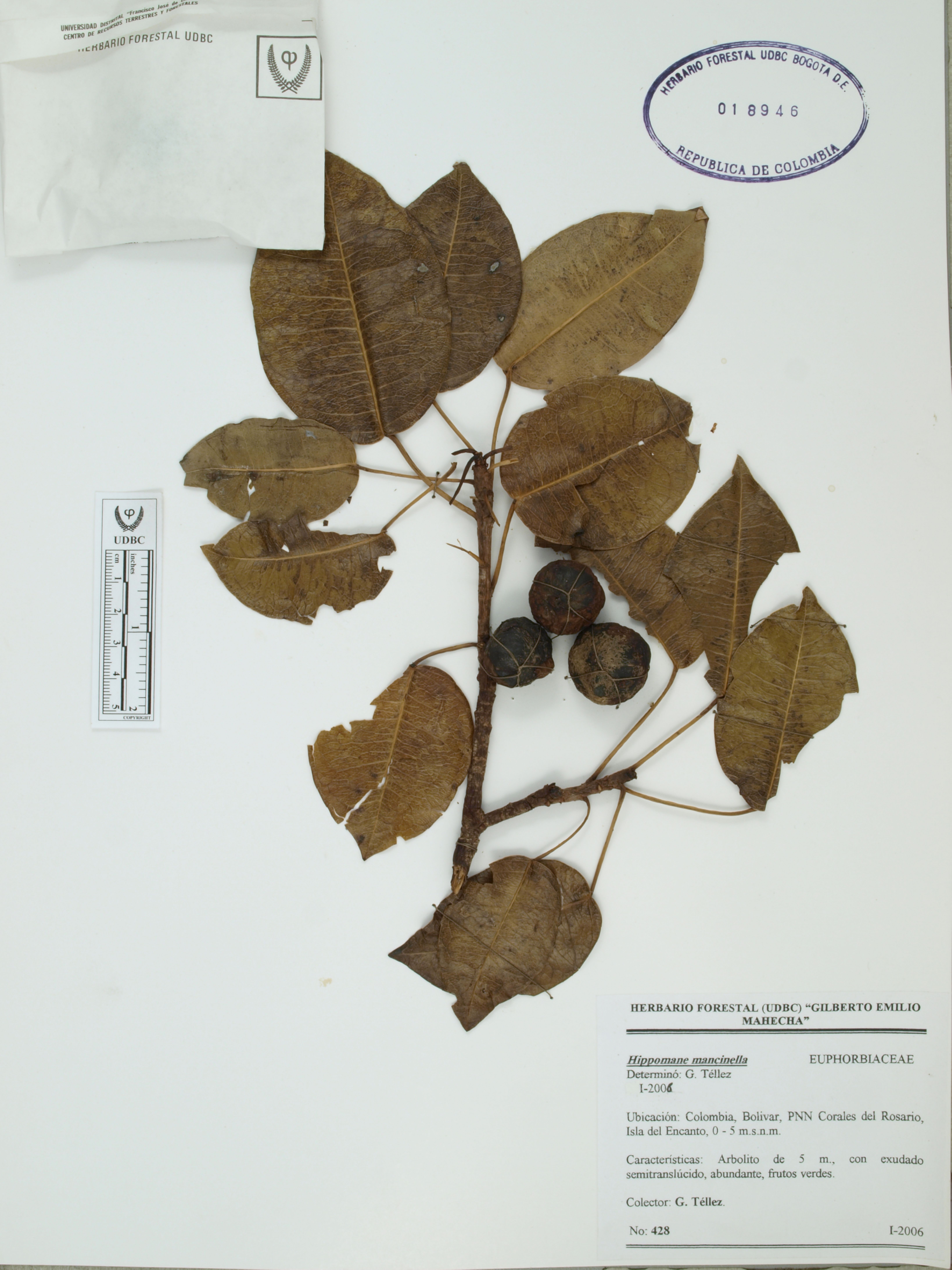 Fotografía del ejemplar Téllez, G. 428, determinado como Hippomane mancinella en el año 2006