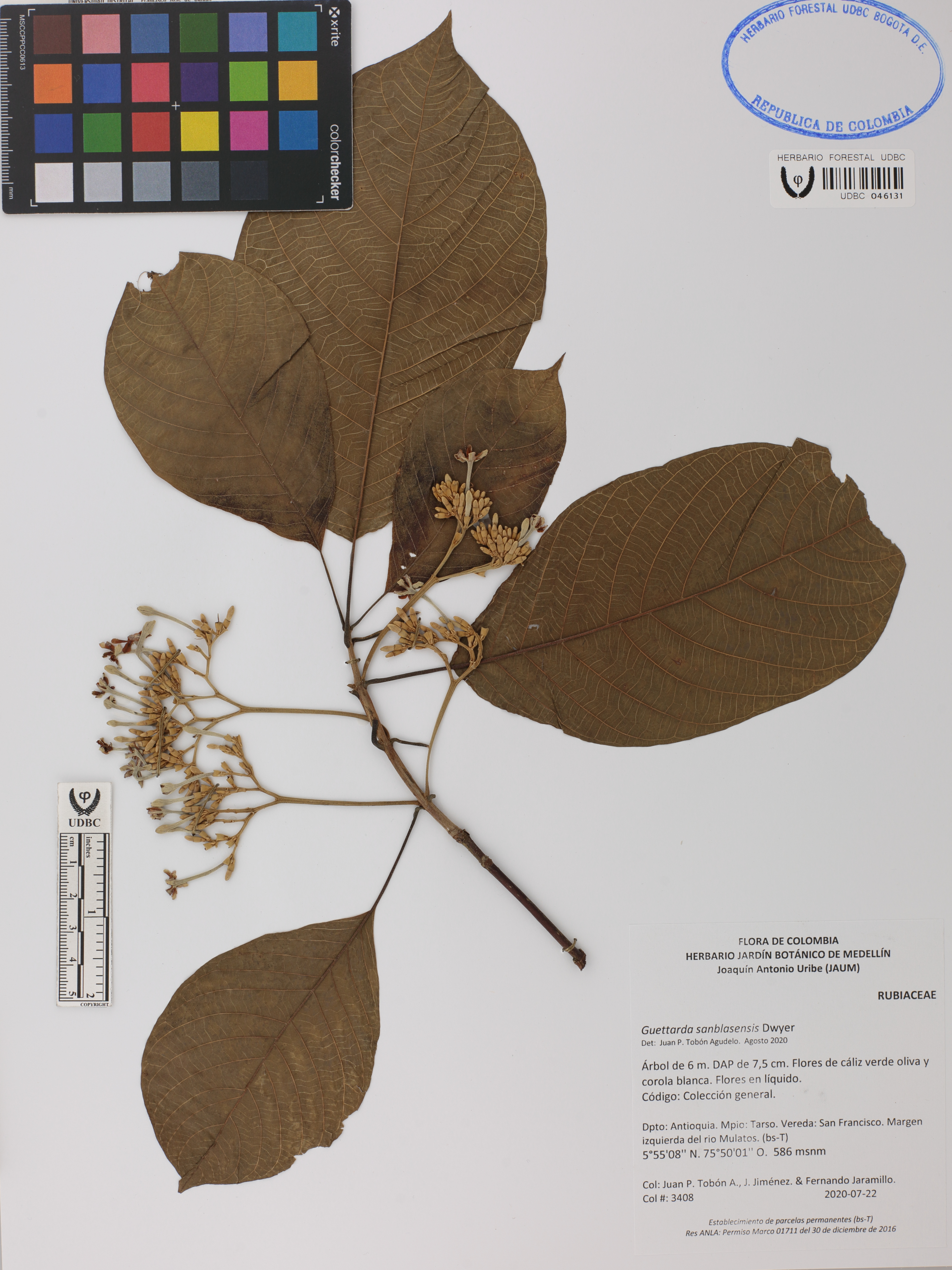 Fotografía del ejemplar Tobón-Agudelo, J. 3408, determinado como Guettarda sanblasensis en el año 2020
