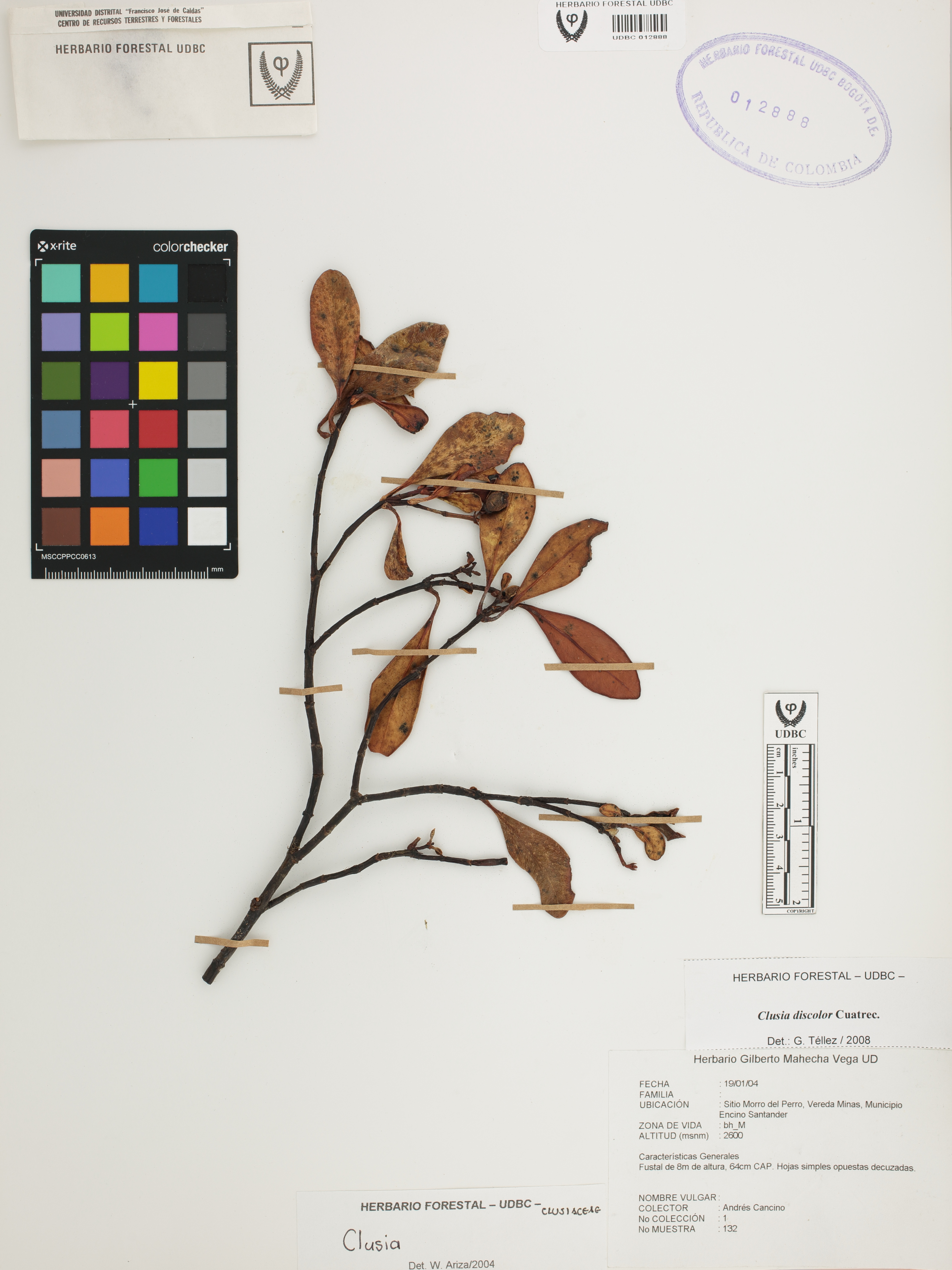 Fotografía del ejemplar Cancino, A. 132, determinado como Clusia discolor en el año 2008