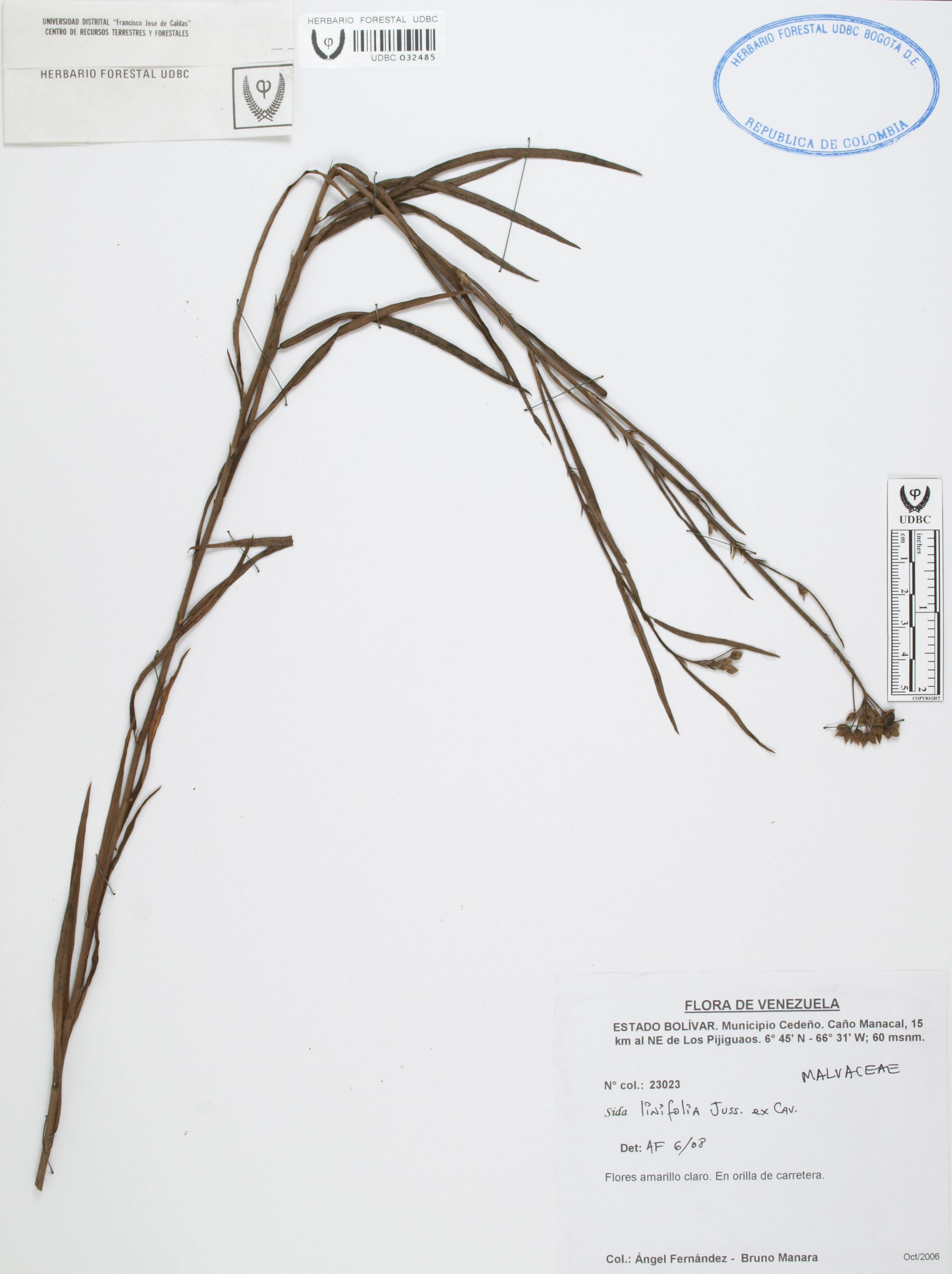 Fotografía del ejemplar Fernández, A. 23023, determinado como Sida linifolia en el año 2008