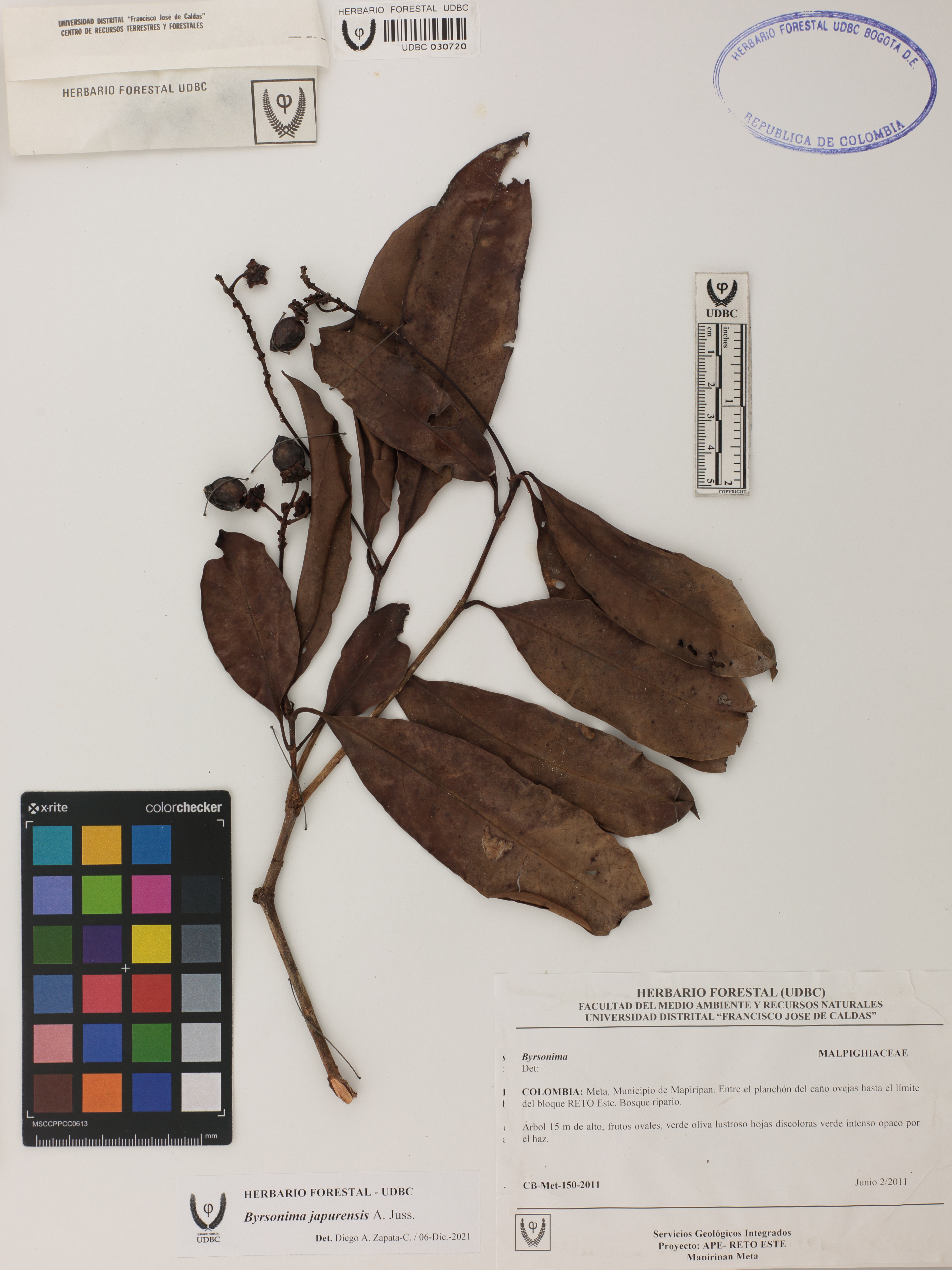 Fotografía del ejemplar SD 150, determinado como Byrsonima japurensis en el año 2021